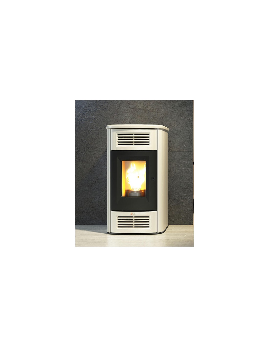 Stufa a pellet ventilata con top e frontalino in ceramica, fianchi in acciaio verniciato con possibilità di doppia canalizzazione regolabile. Elegante porta in ghisa verniciata in nero con cristallo panoramico ceramico. Telecomando, cassetto cenere e maniglia estraibili.