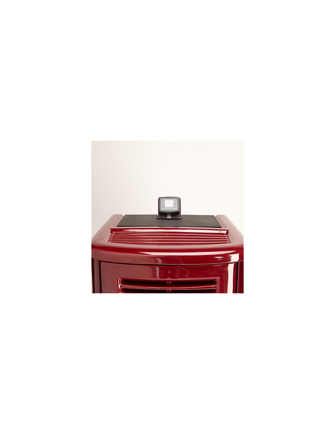 Stufa a pellet ventilata con top e frontalino in ceramica, fianchi in acciaio verniciato con possibilità di doppia canalizzazione regolabile. Elegante porta in ghisa verniciata in nero con cristallo panoramico ceramico. Telecomando, cassetto cenere e maniglia estraibili.