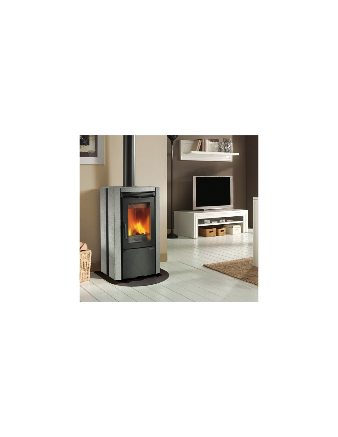 Stufa e legna con rivestimento in pietra naturale