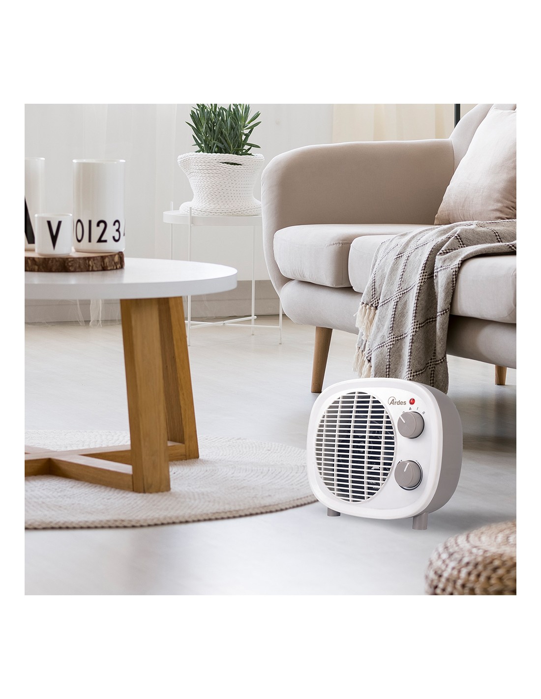 Termoventilatore. 2 livelli di potenza: eco e comfort. Ventilazione estiva. Termostato di regolazione della temperatura. Spia di funzionamento. Sistema di protezione anti surriscaldamento. Potenza 1700/2000W.