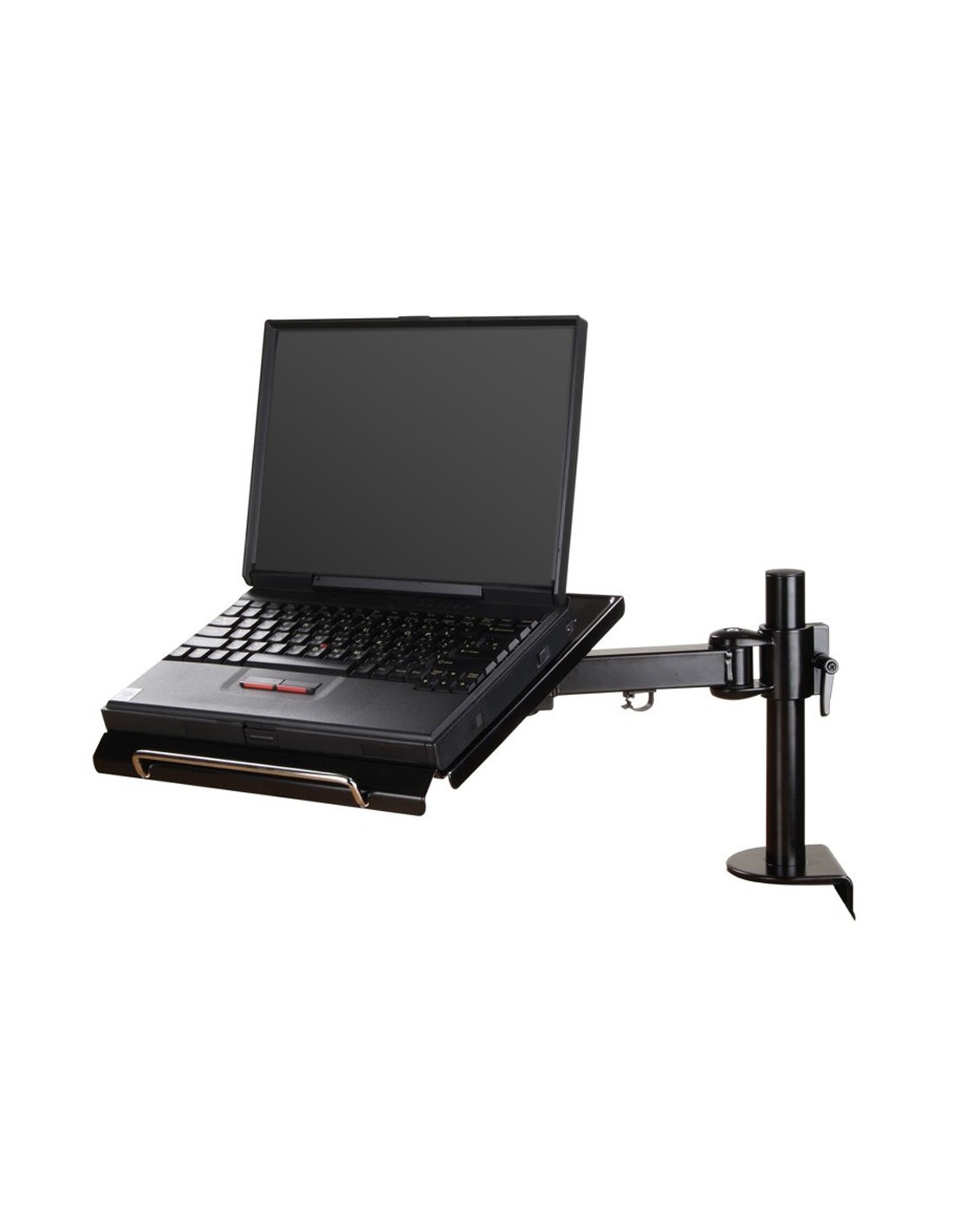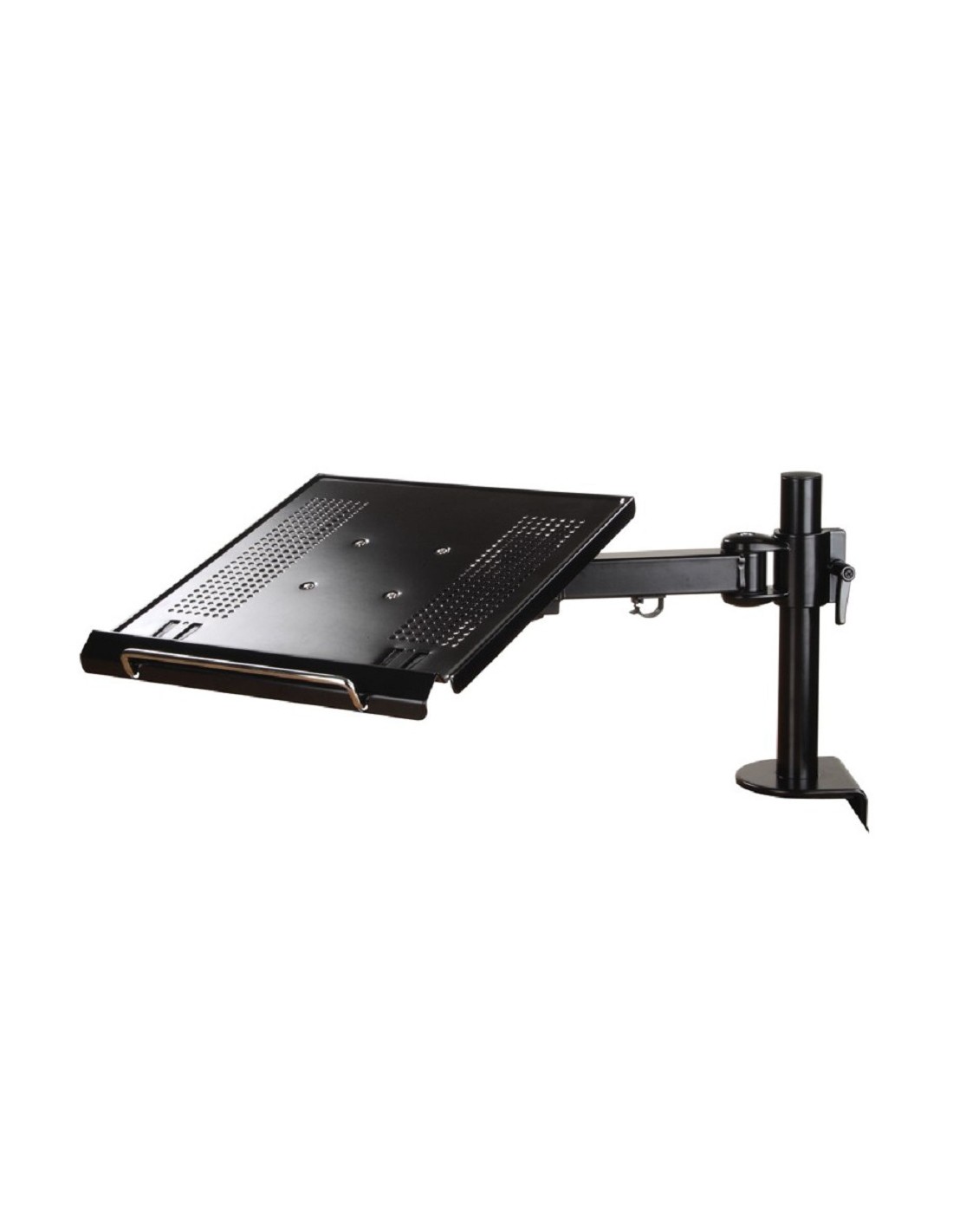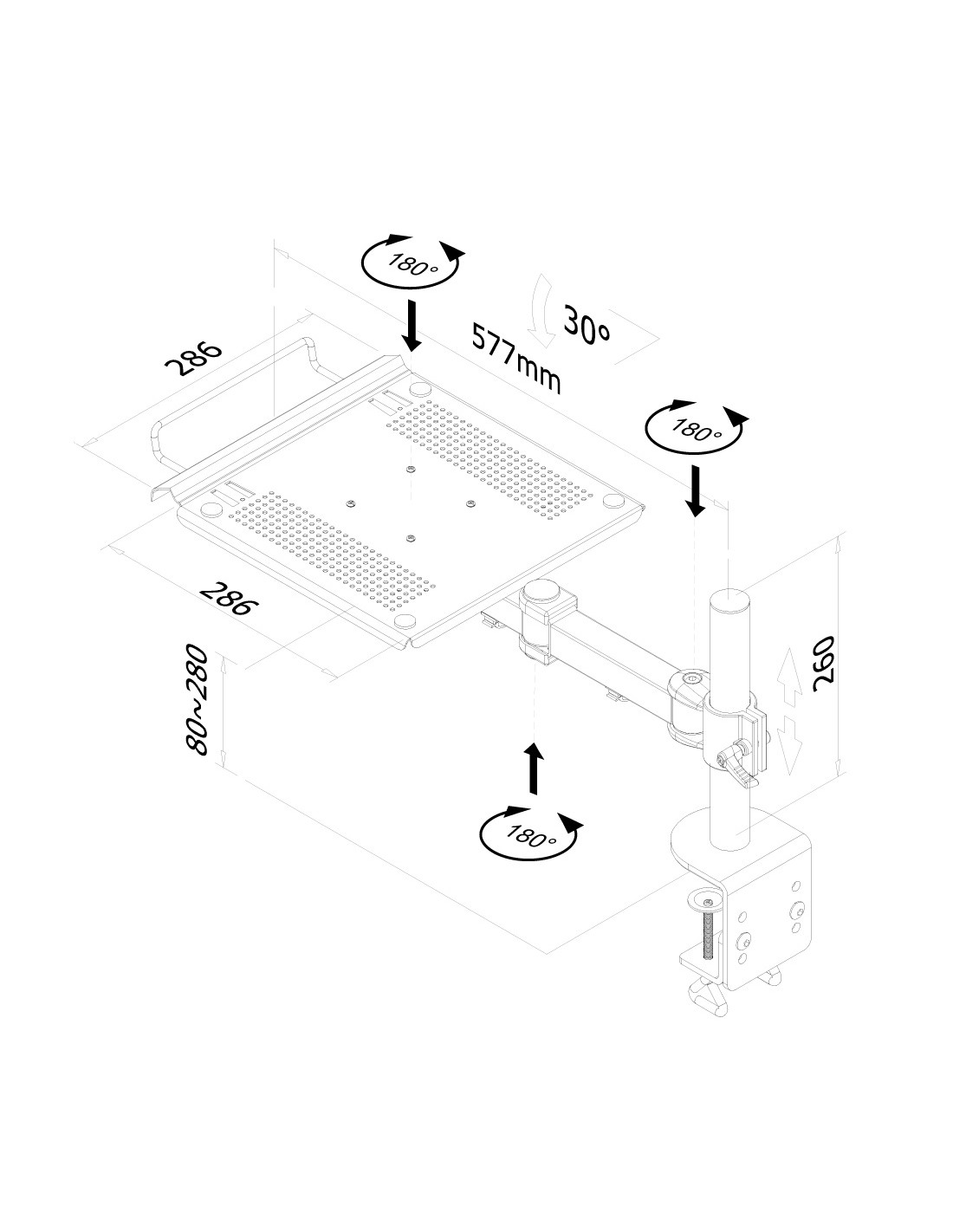 Questo supporto consente di far oscillare il notebook in qualsiasi direzione desiderata per ottenere la migliore posizione di lavoro, profondità da 0 a 57 cm e altezza da 0 a 26 cm con una capacità massima di trasporto di 15 kg. I cavi possono essere collocati sul lato inferiore del braccio.