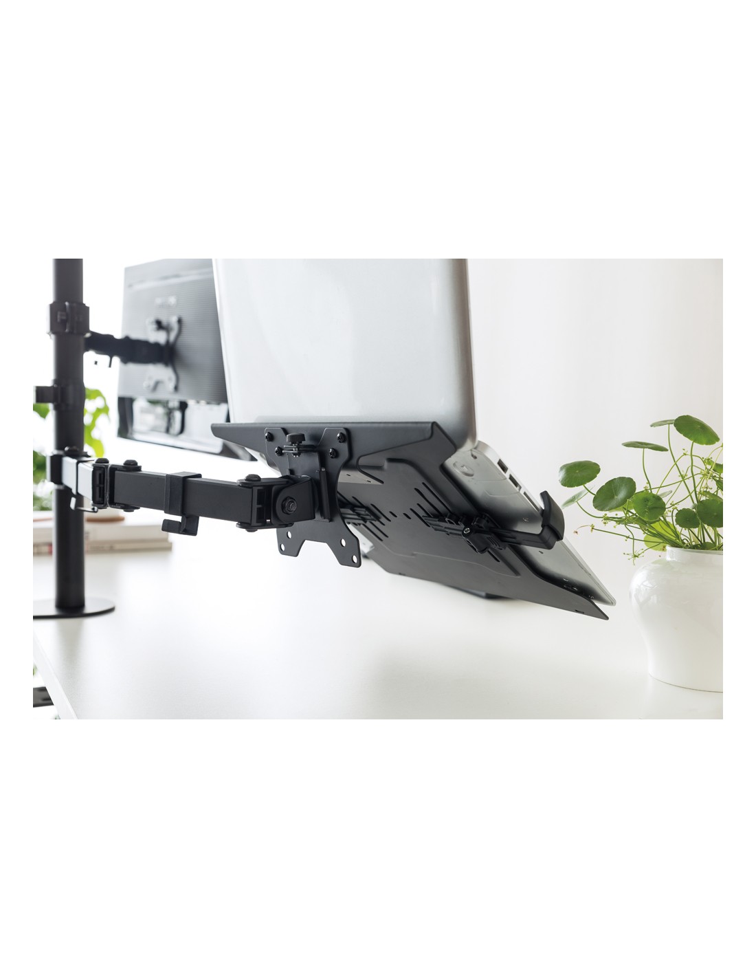 Questo permette di cambiare facilmente l'altezza e la profondità del tuo notebook o telefono grazie al possibile abbinamento con ogni supporto NewStar da parete, soffitto o scrivania.