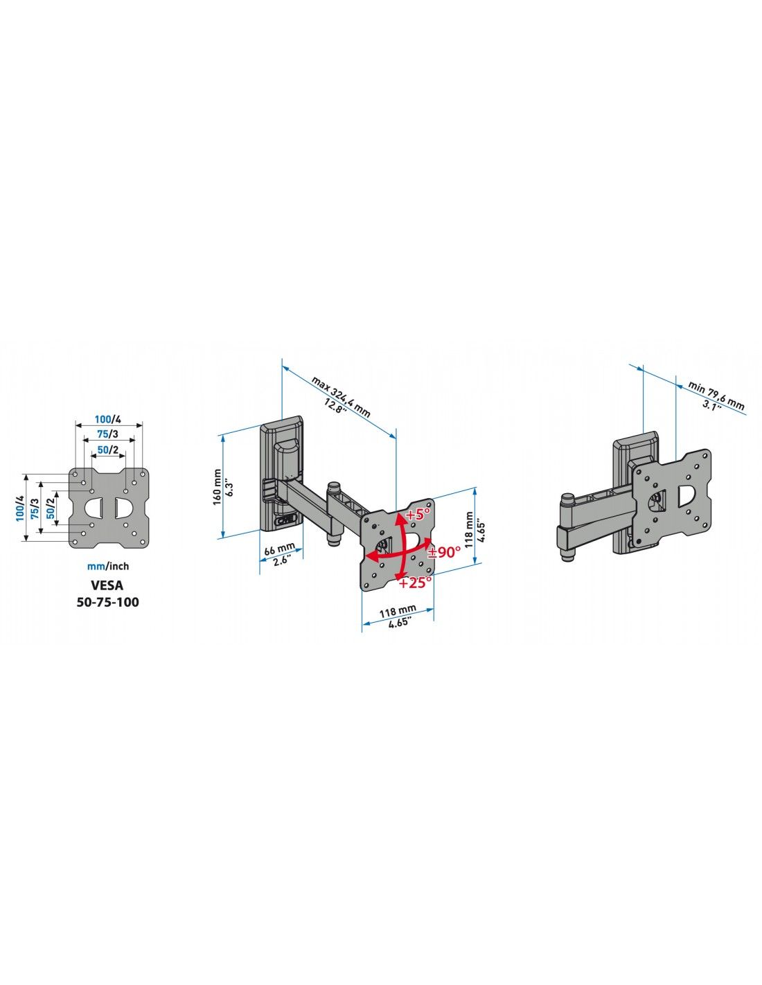 EDR100 è un supporto adatto a tutte le TV con foratura VESA 50 - 75 – 100 mm, il doppio braccio ha un duplice vantaggio: