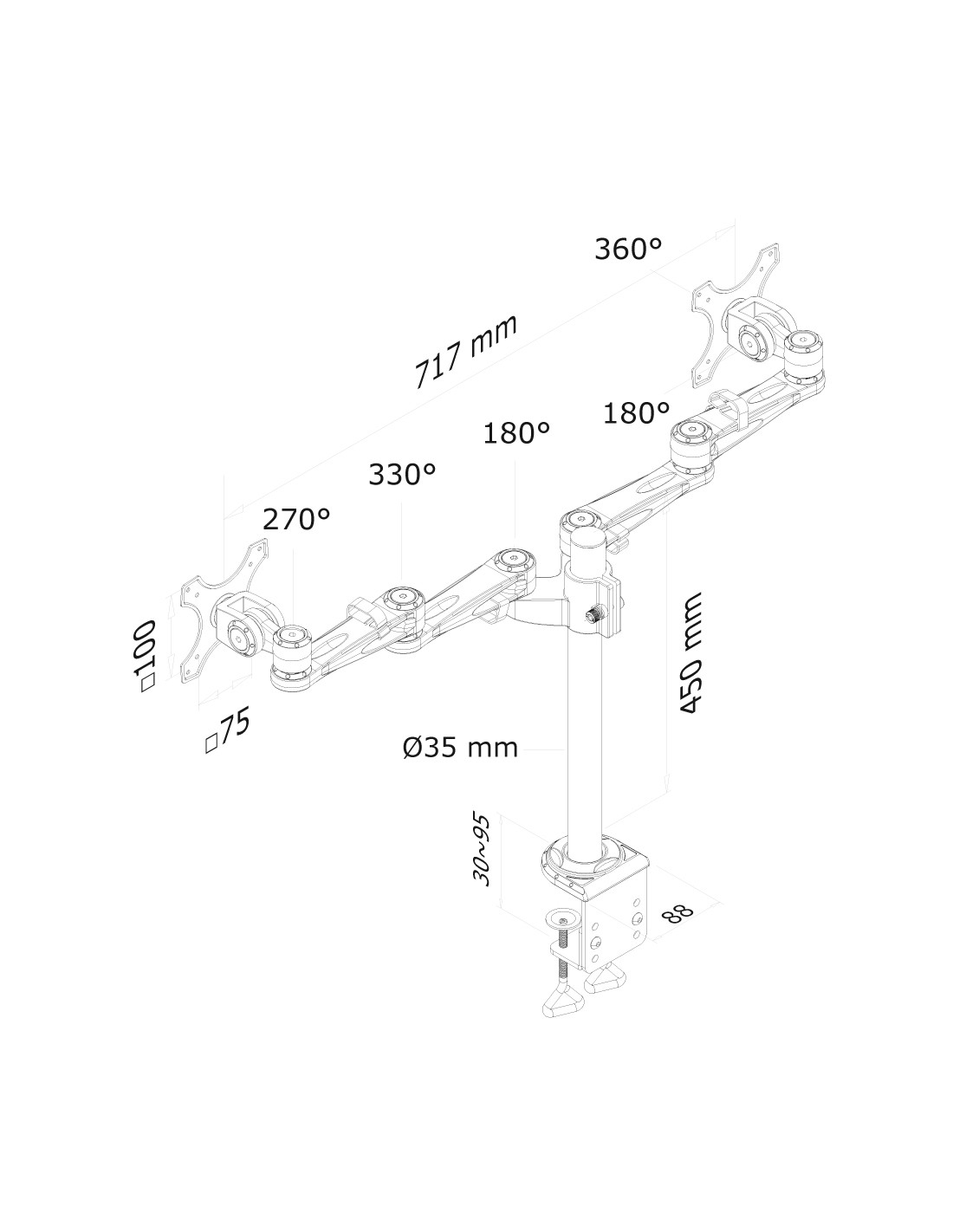 Il supporto FPMA-D935 ha tre punti di articolazione ed è adatto a schermi fino a 27" (69 cm) con una capacità massima di trasporto di 12 kg (6 Kg per ogni schermo). Questo prodotto è adatto per schermi con fori VESA modello 75x75 o 100x100 mm. Per una diversa (più grande) foratura, si può combinare con una delle nostre piastre di adattamento VESA.