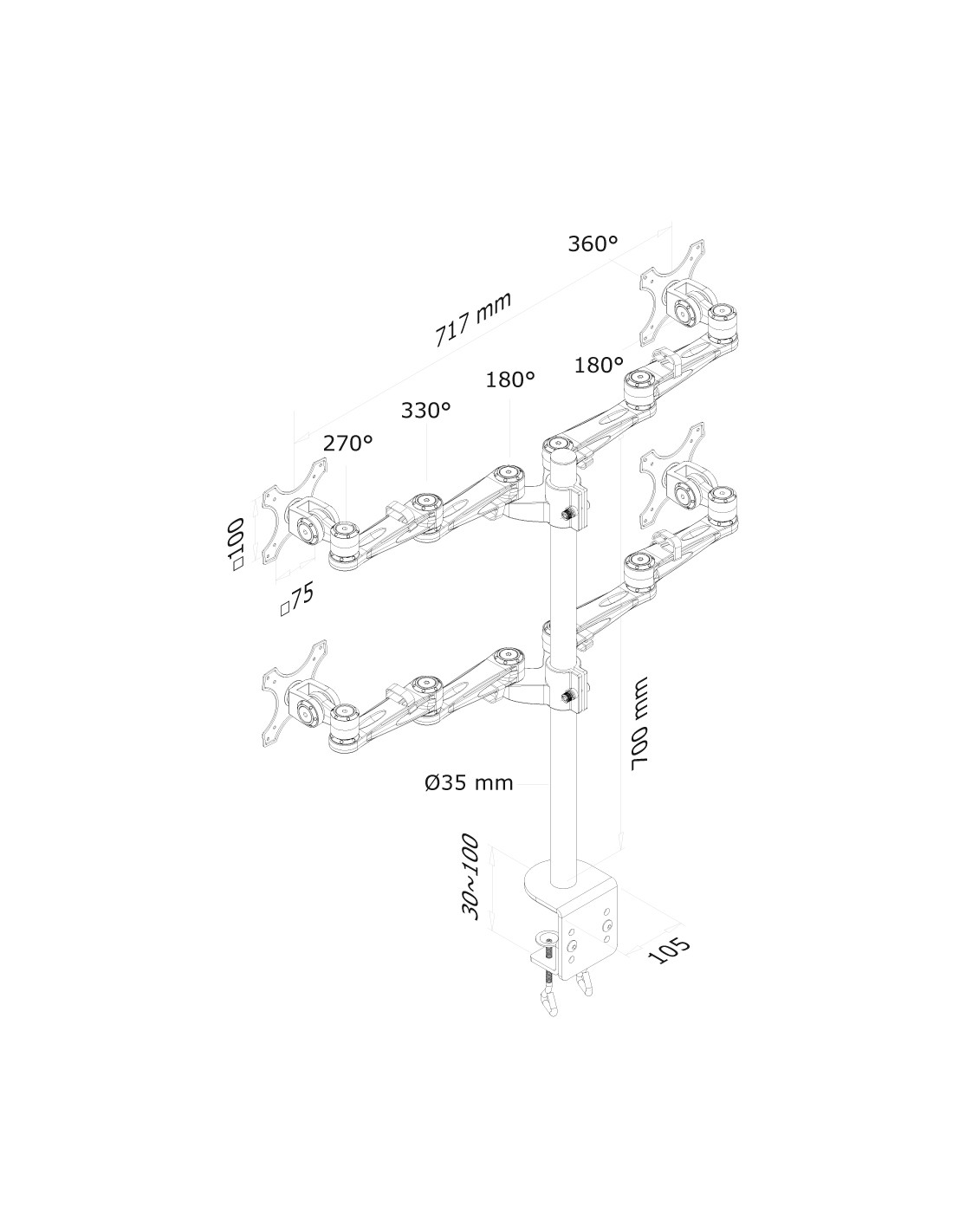Il supporto FPMA-D935D4 ha tre punti di articolazione ed è adatto a schermi fino a 27" (69 cm) con una capacità massima di trasporto di 24 kg (6 Kg per ogni schermo). Questo prodotto è adatto per schermi con fori VESA modello 75x75 o 100x100 mm. Per una diversa (più grande) foratura, si può combinare con una delle nostre piastre di adattamento VESA.