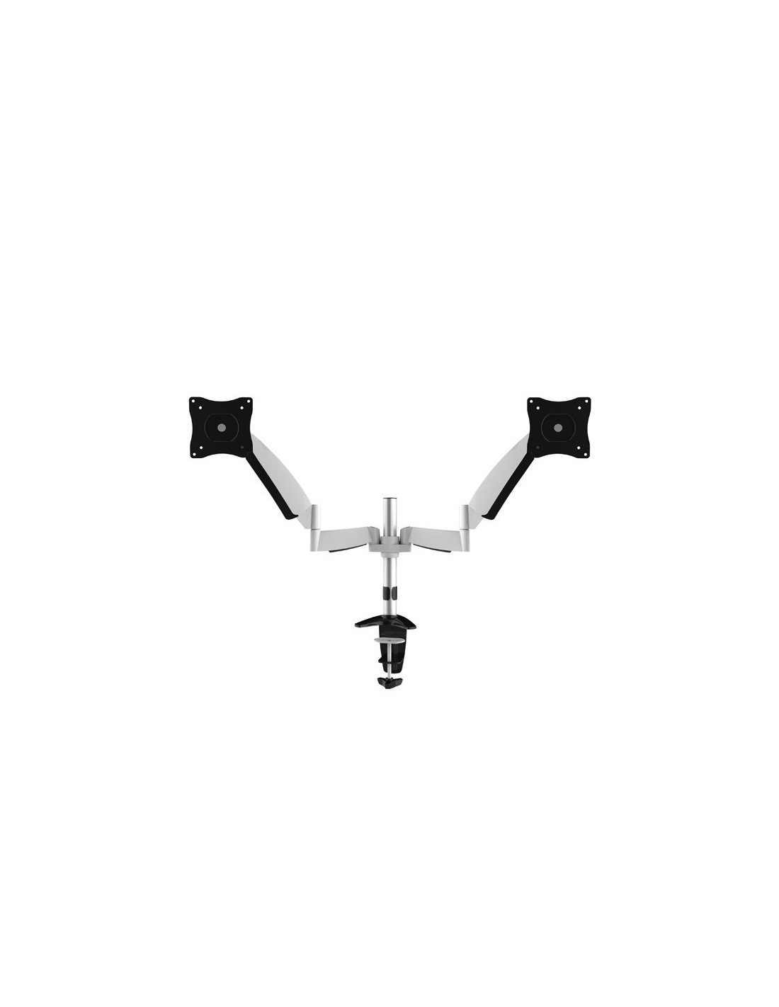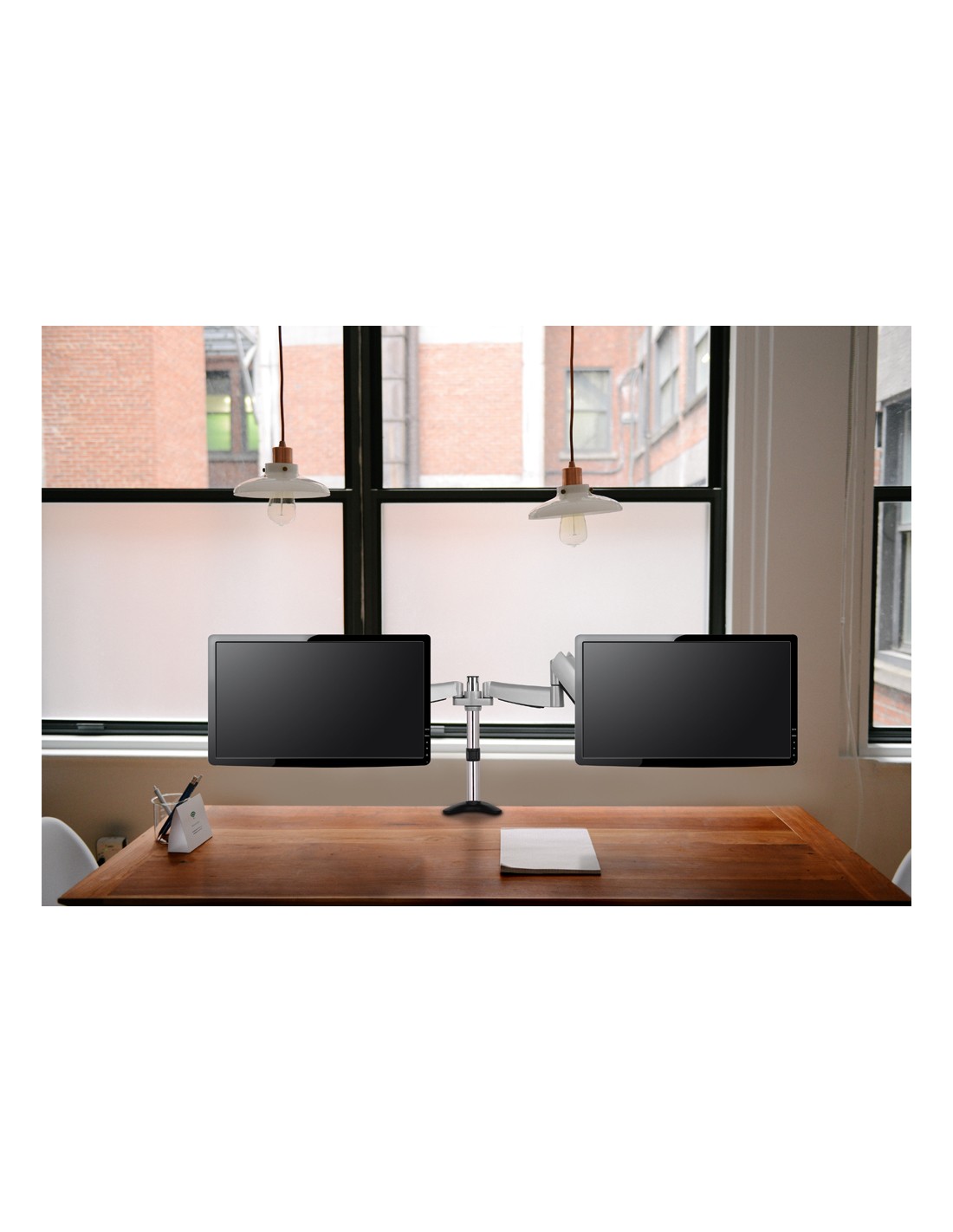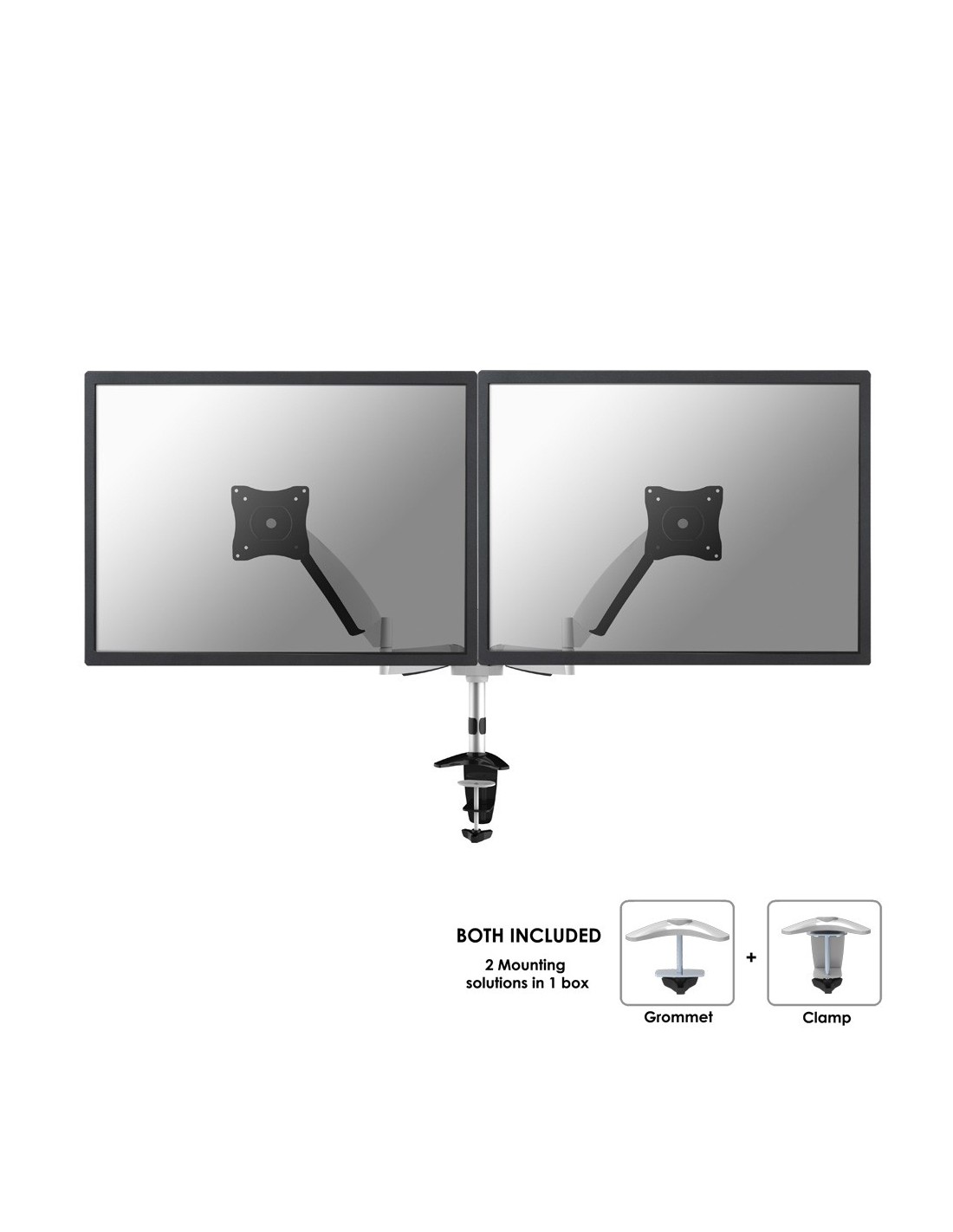 Questo braccio porta monitor NewStar, modello FPMA-D950D consente di collegare due schermi LCD/LED/TFT su di una scrivania con la modalità di fissaggio su piano attraverso un morsetto o vite centrale (entrambe sono incluse).