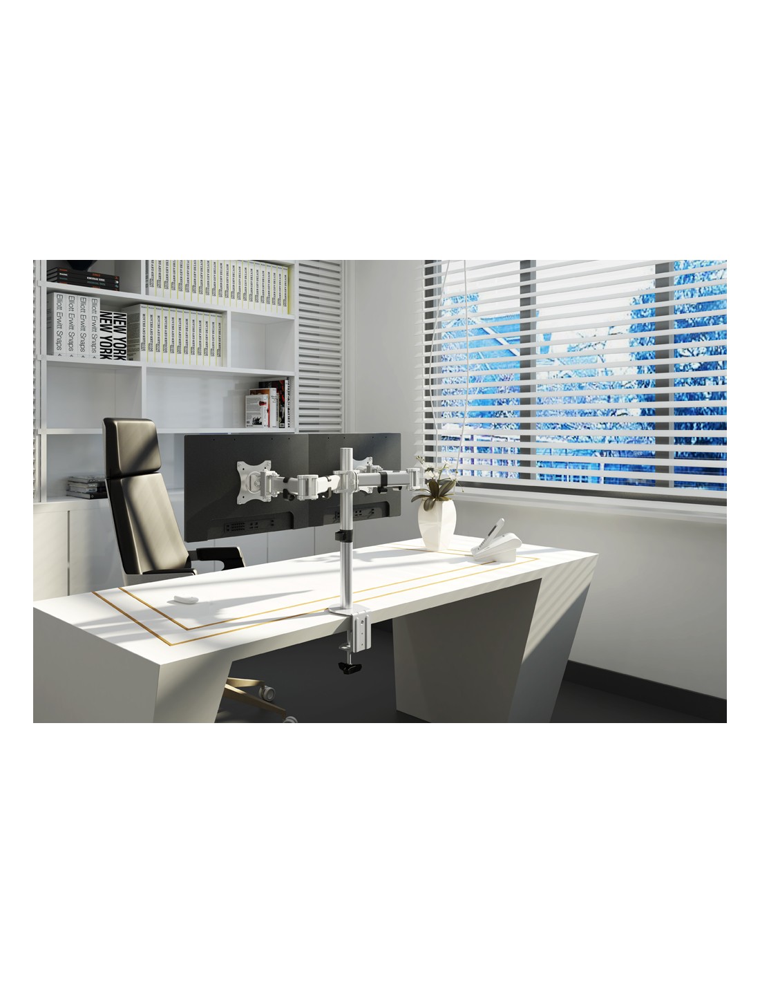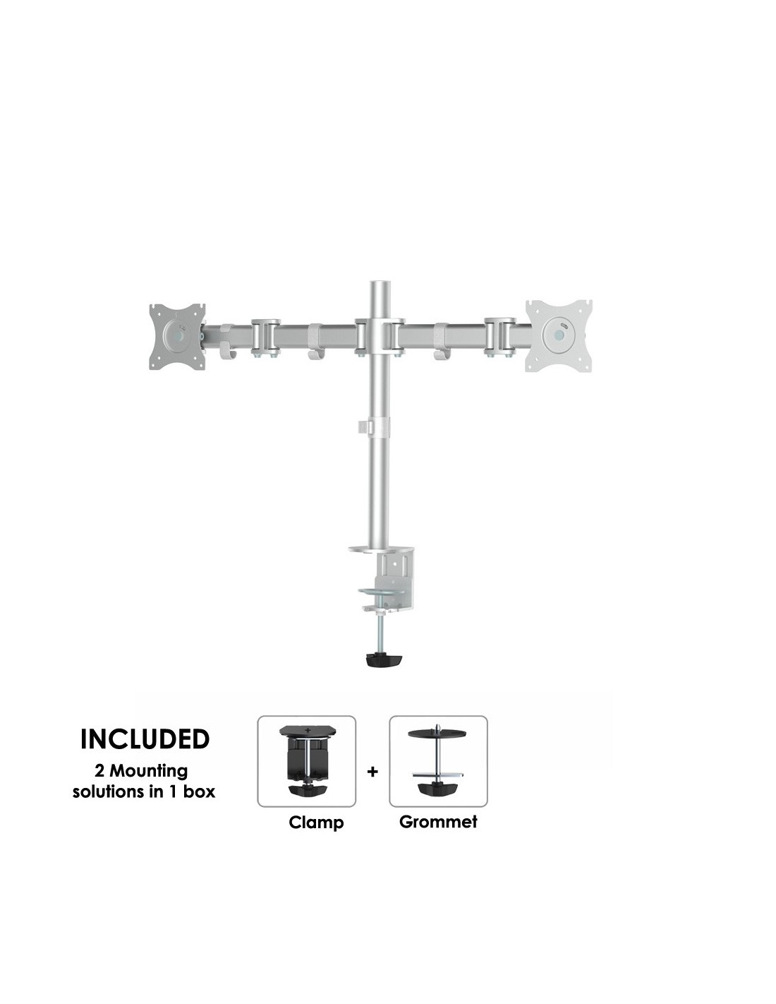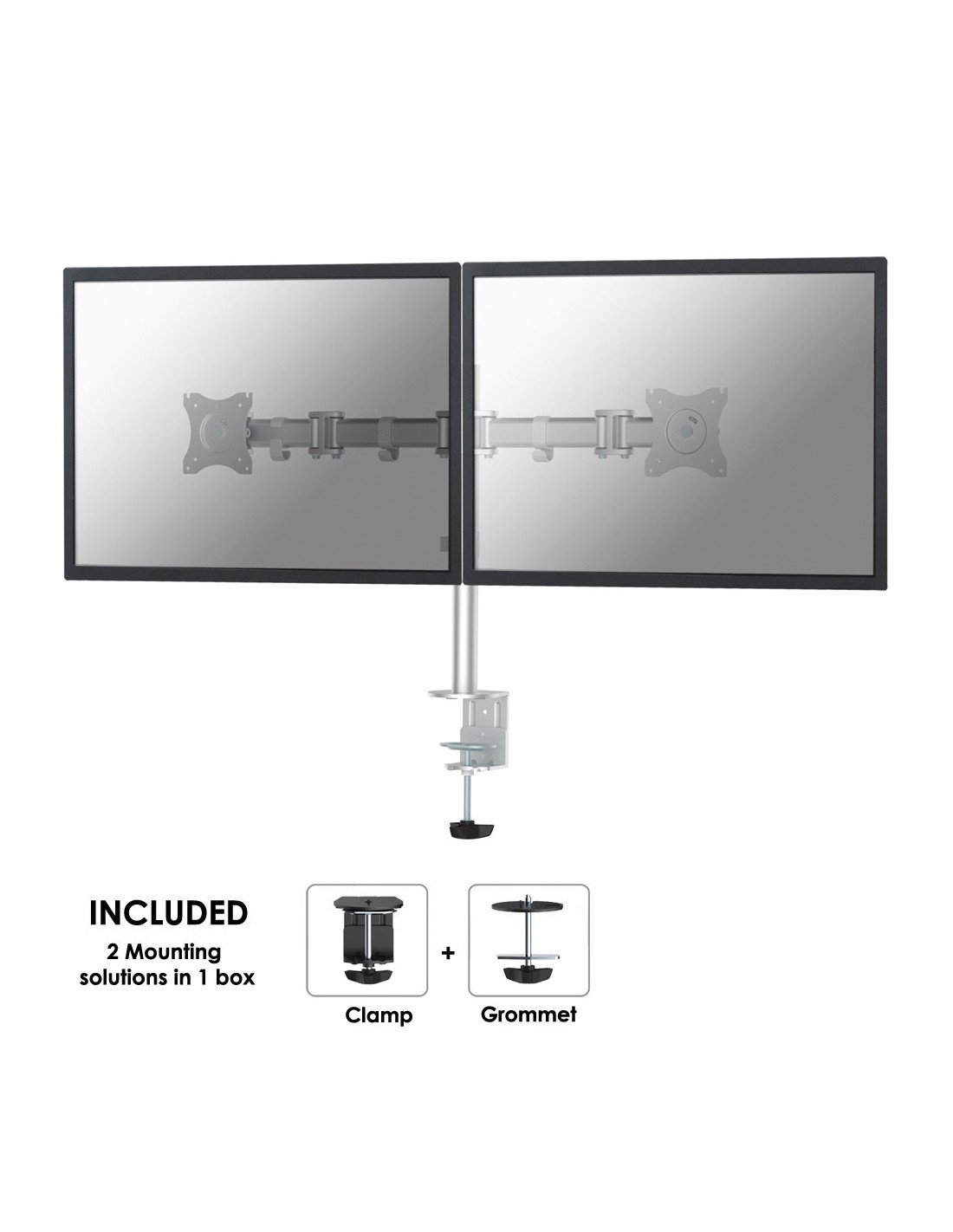 Questo braccio porta monitor NewStar, modello NM-D135DSILVER consente di collegare due schermi LCD/LED/TFT su di una scrivania con la modalità di fissaggio su piano attraverso vite centrale o morsetto.