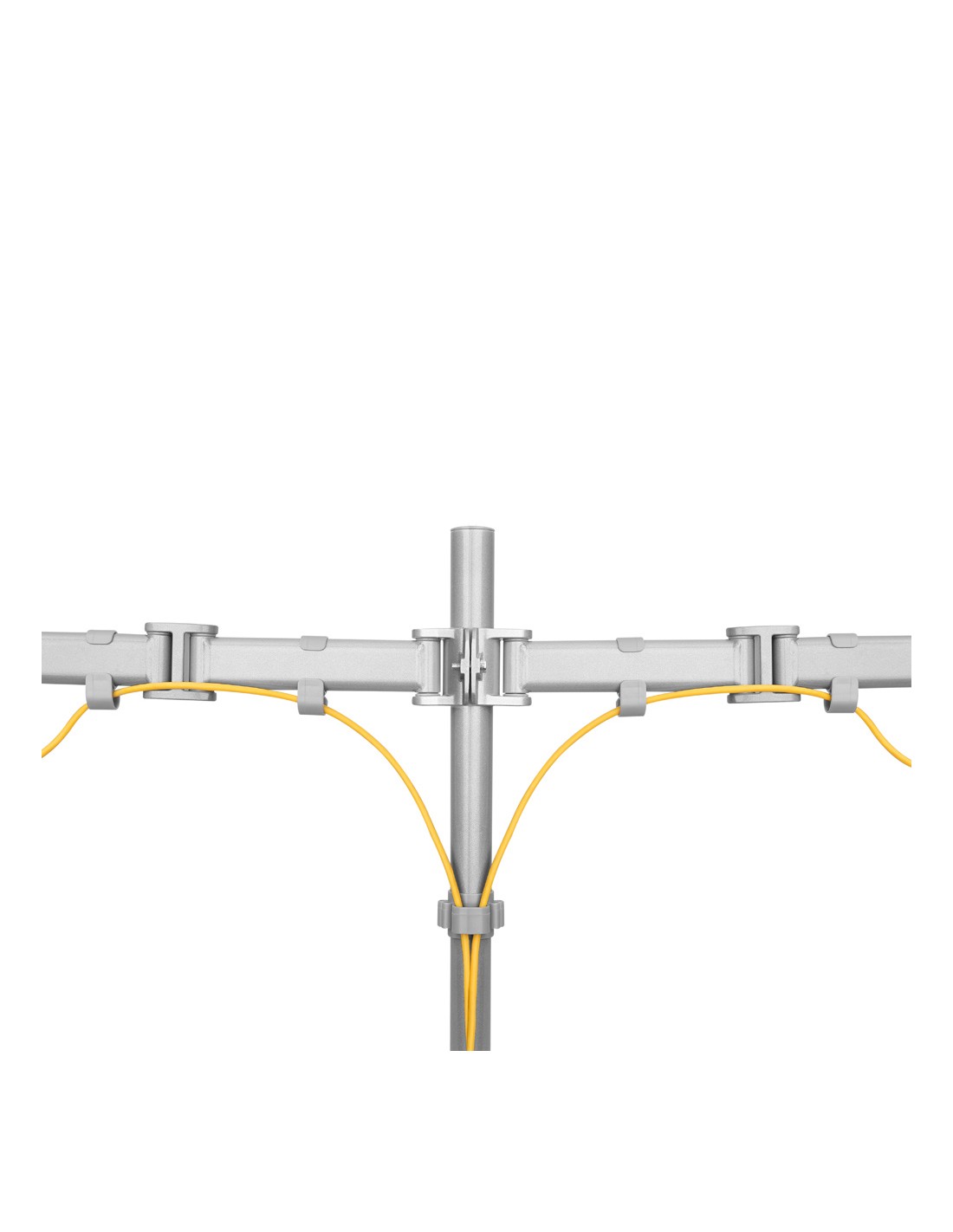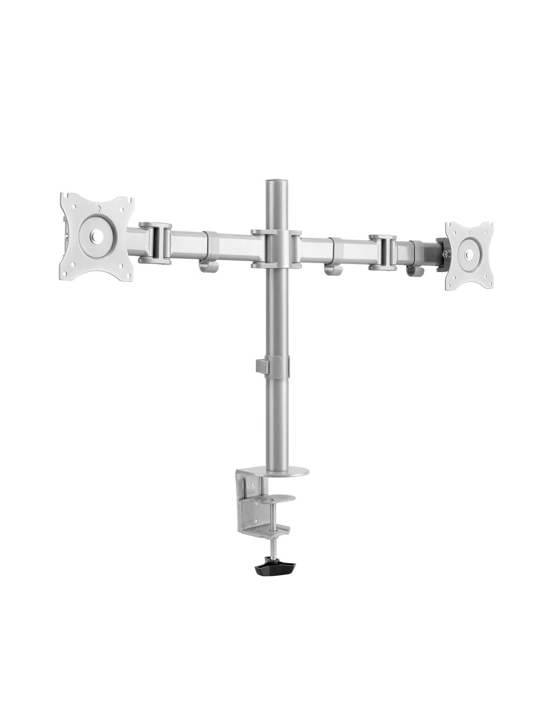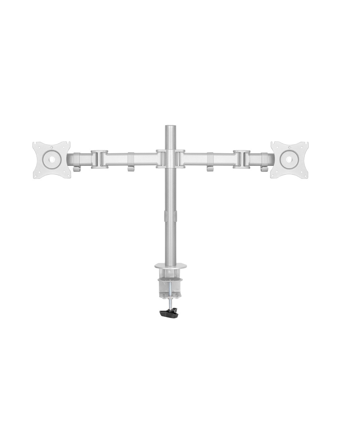 Questo braccio porta monitor NewStar, modello NM-D135DSILVER consente di collegare due schermi LCD/LED/TFT su di una scrivania con la modalità di fissaggio su piano attraverso vite centrale o morsetto.