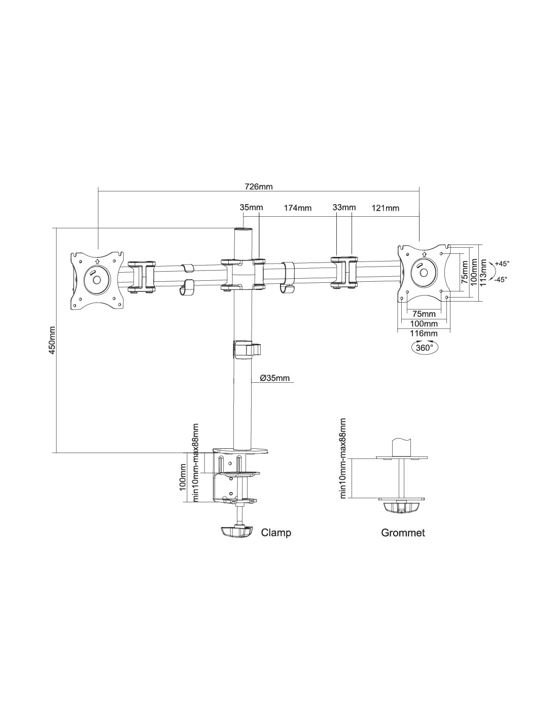 Il supporto NM-D135DSILVER ha tre punti di articolazione ed è adatto a schermi fino a 27" (69 cm) con una capacità massima di trasporto di 16 kg (8 Kg per ogni schermo). Questo prodotto è adatto per schermi con fori VESA modello 75x75 o 100x100 mm. Per una diversa (più grande) foratura, si può combinare con una delle nostre piastre di adattamento VESA.