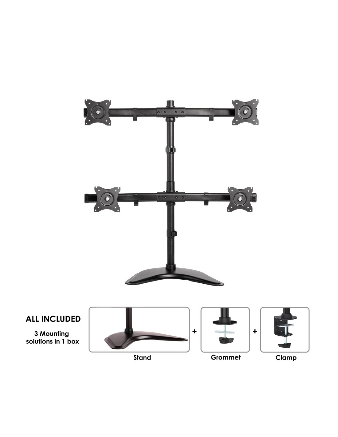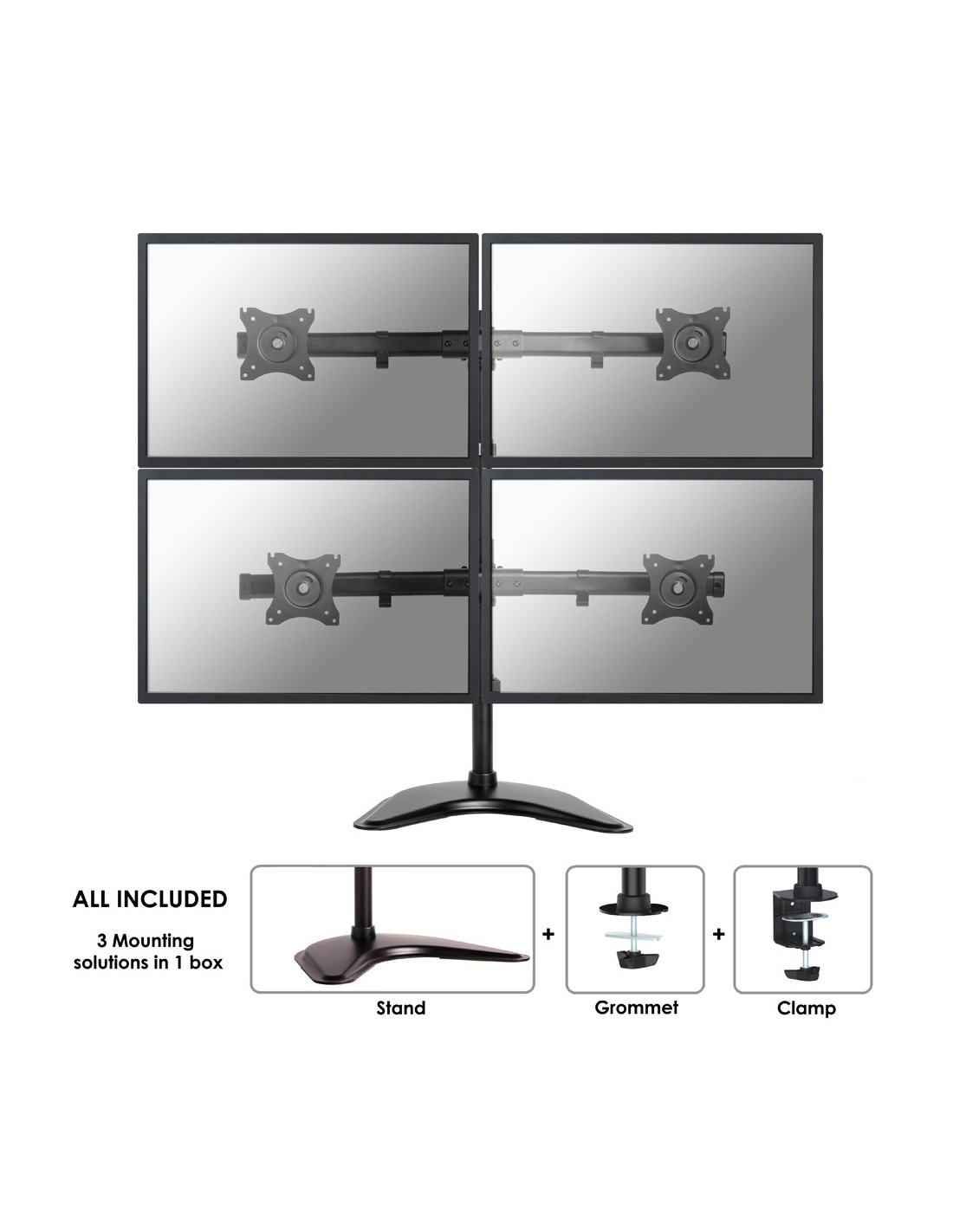 Questo braccio porta monitor NewStar, modello NM-D335D4BLACK consente di collegare 4 schermi LCD/LED/TFT su di una scrivania con la modalità di fissaggio su piano attraverso vite centrale o morsetto.