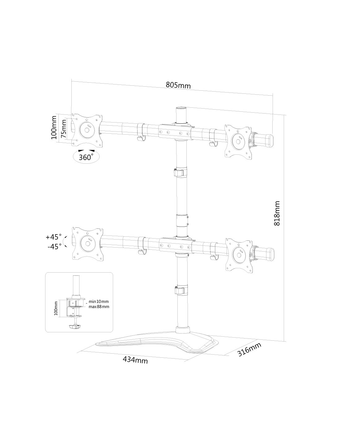 Il supporto NM-D335D4BLACK ha 1 punto di articolazione ed è adatto a schermi fino a 27" (69 cm) con una capacità massima di trasporto di 8 kg per ogni schermo. Questo prodotto è adatto per schermi con fori VESA modello 75x75 o 100x100 mm. Per una diversa (più grande) foratura, si può combinare con una delle nostre piastre di adattamento VESA.