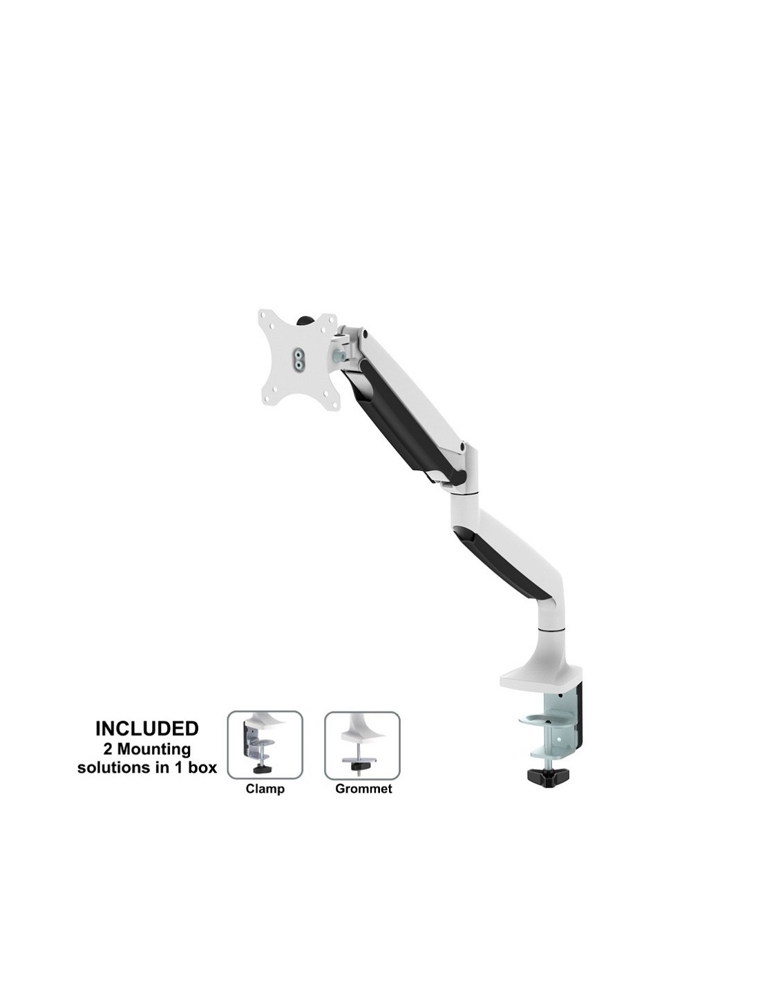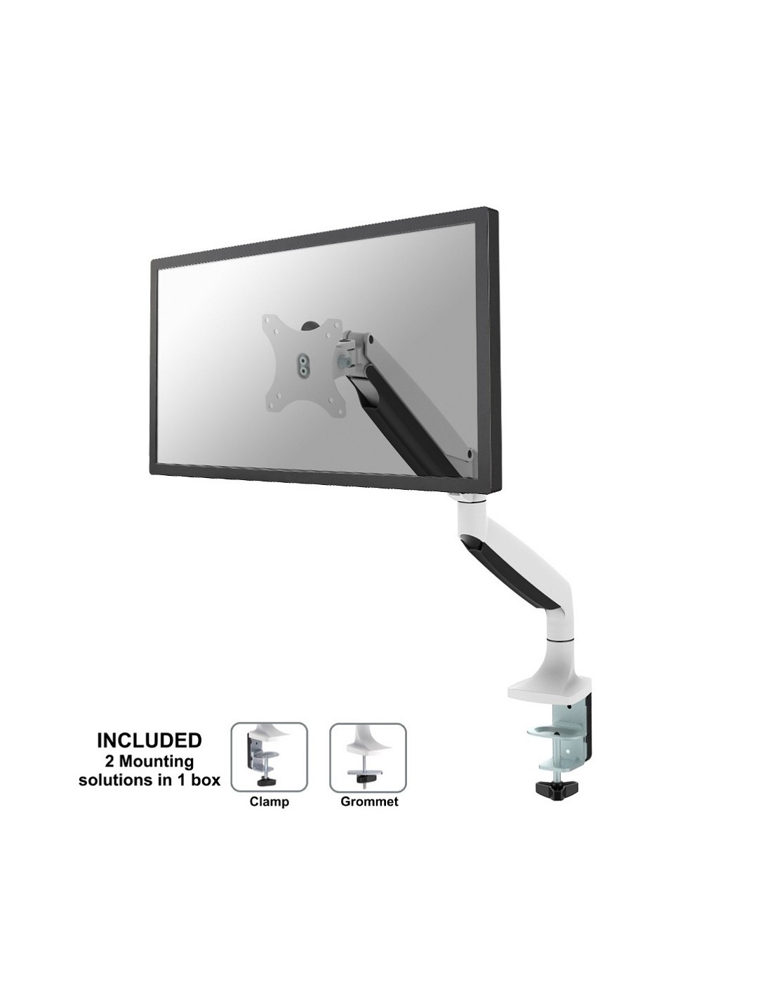Questo braccio porta monitor NewStar, modello NM-D750WHITE consente di collegare uno schermo LCD/LED/TFT su di una scrivania con la modalità di fissaggio su piano attraverso un morsetto o vite centrale (entrambe sono incluse).