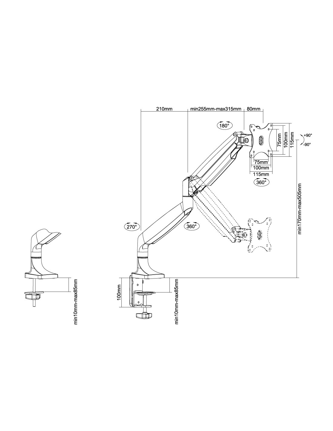 Utilizzate un braccio porta monitor per sfruttare pienamente le capacità del vostro schermo. Il braccio è facile da regolare in altezza e profondità. È inoltre possibile inclinare lo schermo in senso verticale, orizzontale e farlo ruotare; questo crea la posizione ergonomica di lavoro ideale riducendo il rischio di mal di schiena e al collo. I cavi possono essere collocati sulla parte inferiore del braccio.
