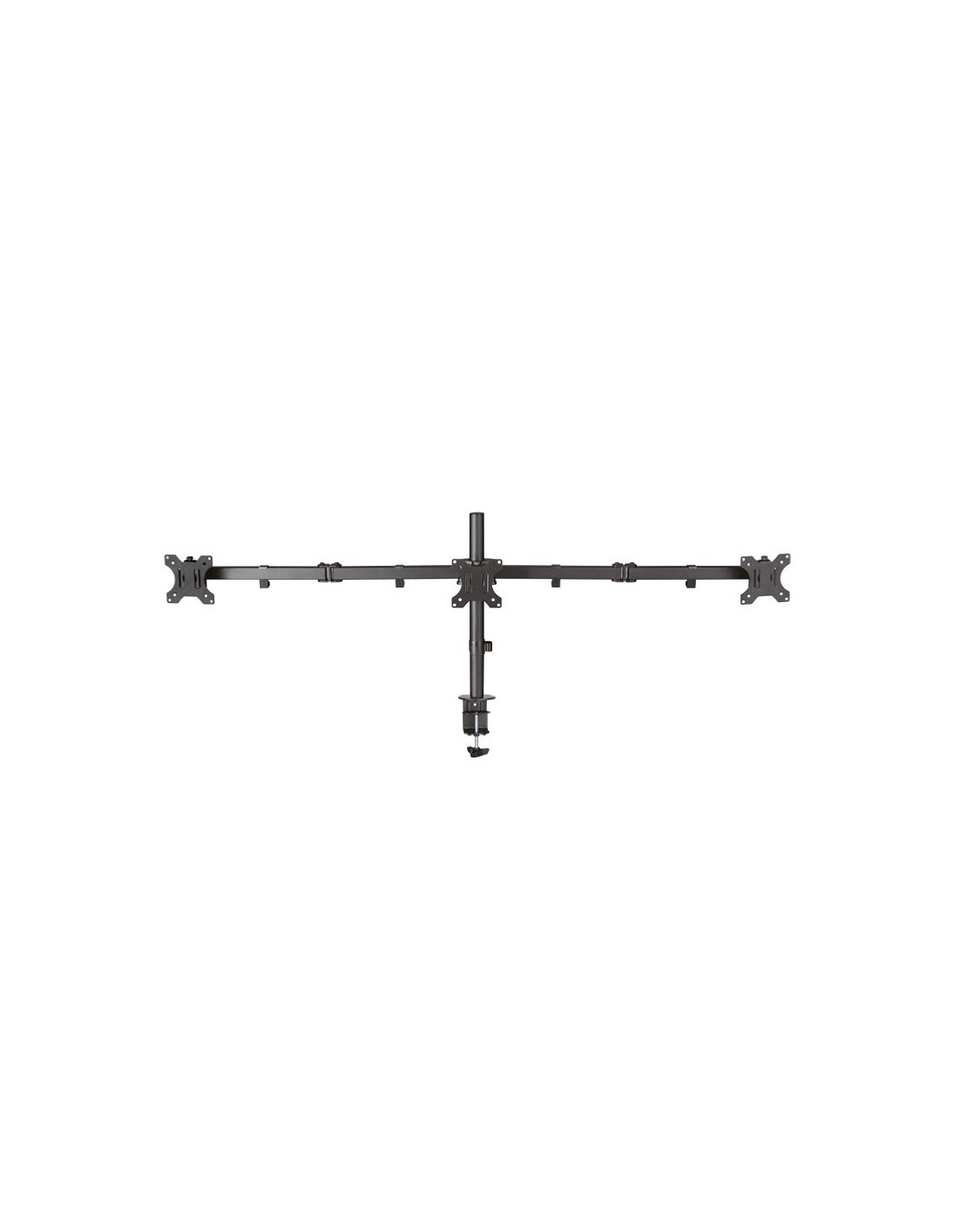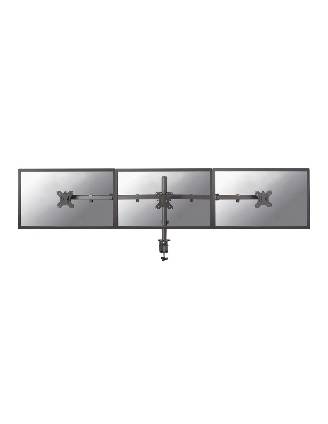 Questo braccio porta monitor NewStar, modello FPMA-D550D3BLACK consente di collegare 3 schermi LCD/LED/TFT su di una scrivania con la modalità di fissaggio su piano attraverso vite centrale o morsetto.