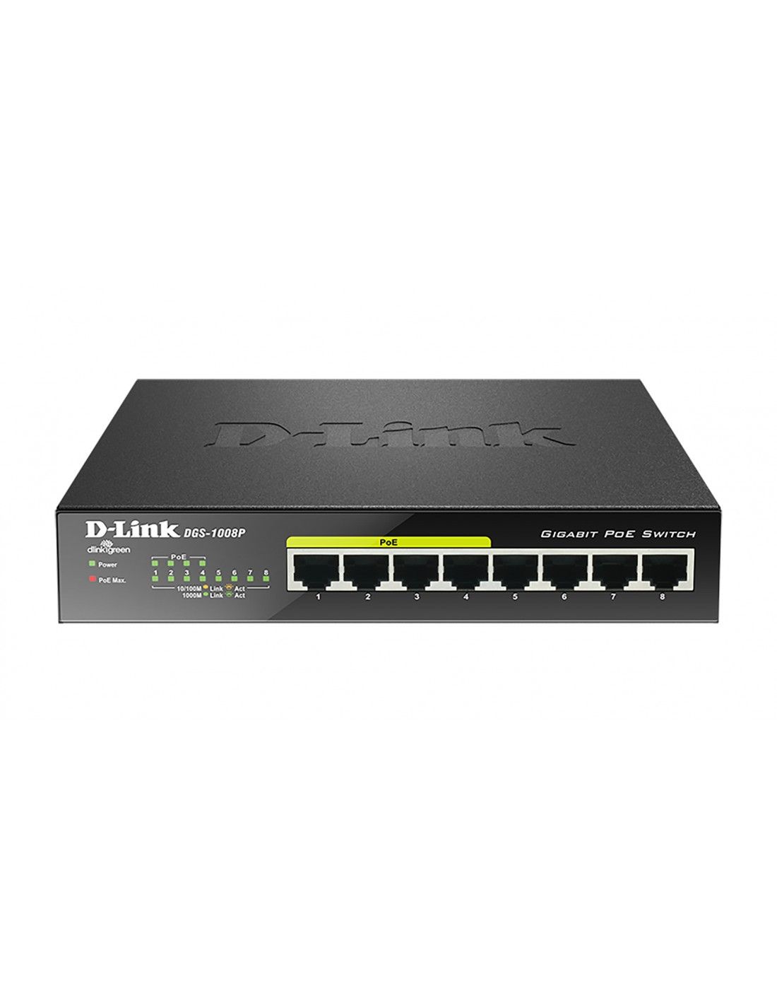 D-Link DGS-1008P. Tipo interruttore: Non gestito. Tipo di porte RJ-45: Gigabit Ethernet (10/100/1000), Quantità di porte RJ-45: 8. Full duplex. Dimensioni tavola MAC: 8000 voci, Capacità di commutazione: 16 Gbit/s. Standard di rete: IEEE 802.3,IEEE 802.3ac,IEEE 802.3af,IEEE 802.3at,IEEE 802.3u,IEEE 802.3x. Connettore di alimentazione: Jack DC-ingresso. Supporto Power over Ethernet (PoE)