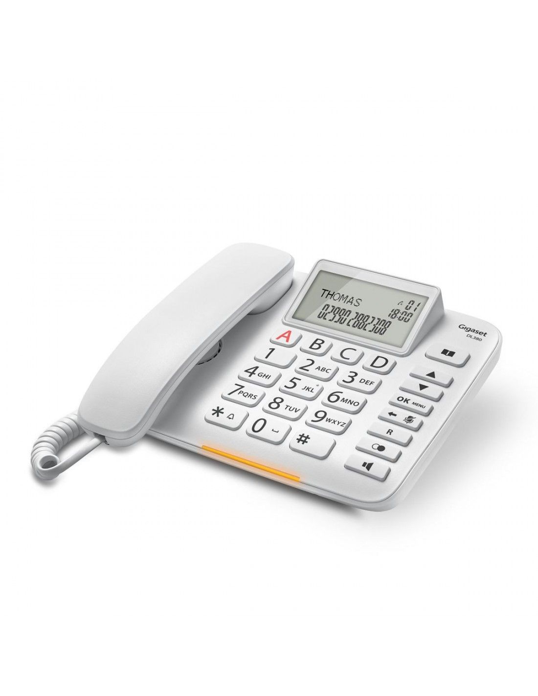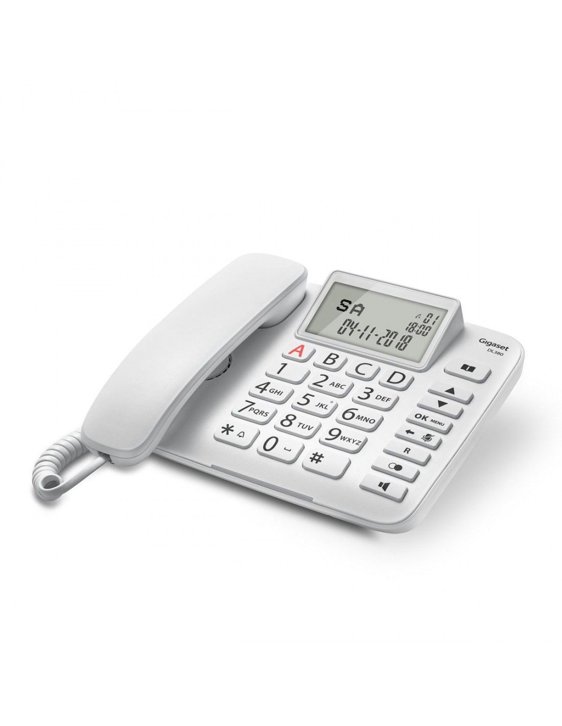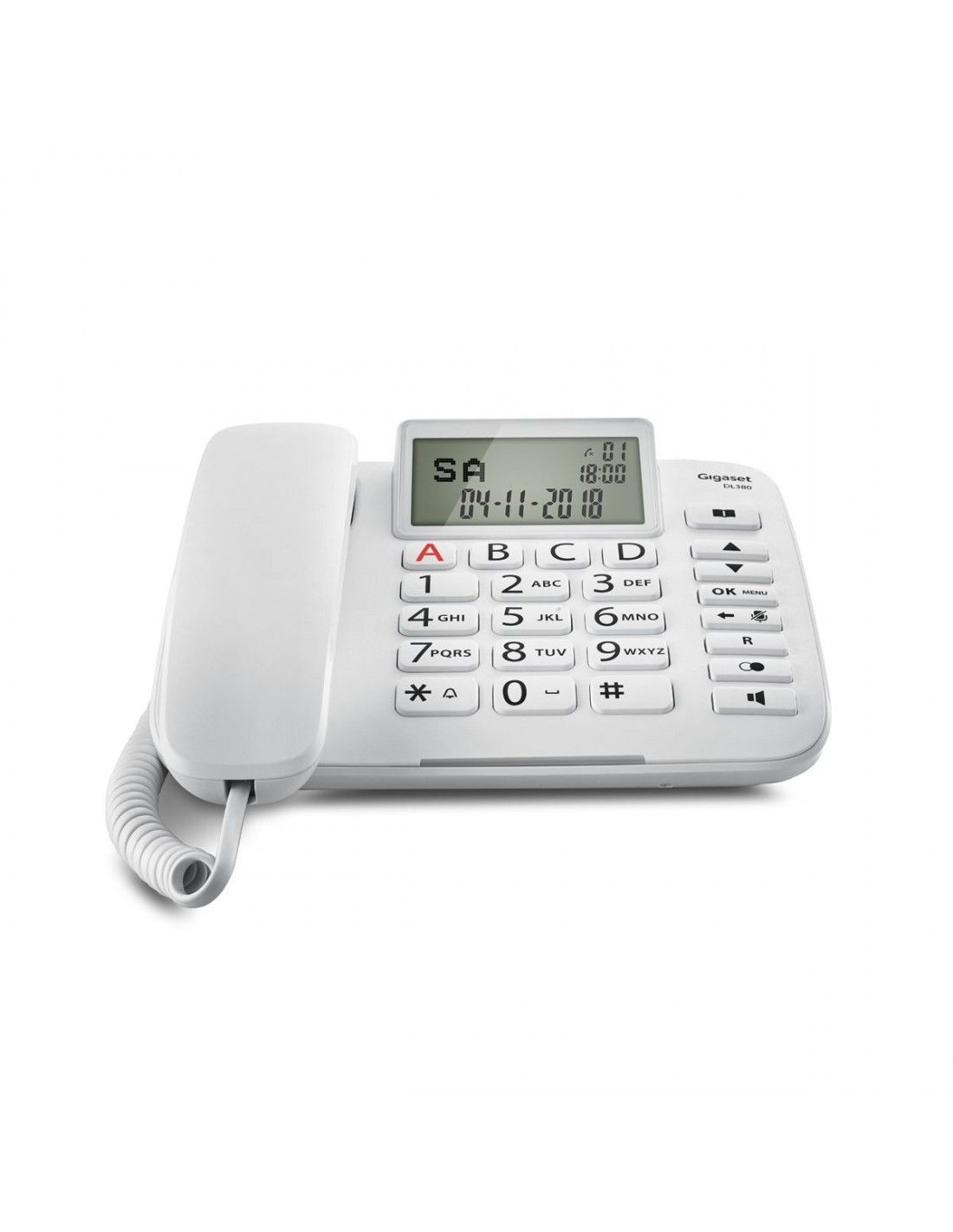 Gigaset DL380. Tipo: Telefono analogico, Tipo di apparecchio: Cornetta cablata. Telefono con vivavoce, Capacità rubrica: 99 voci. Identificatore di chiamata. Colore del prodotto: Bianco. Numero di cornette incluse: 1