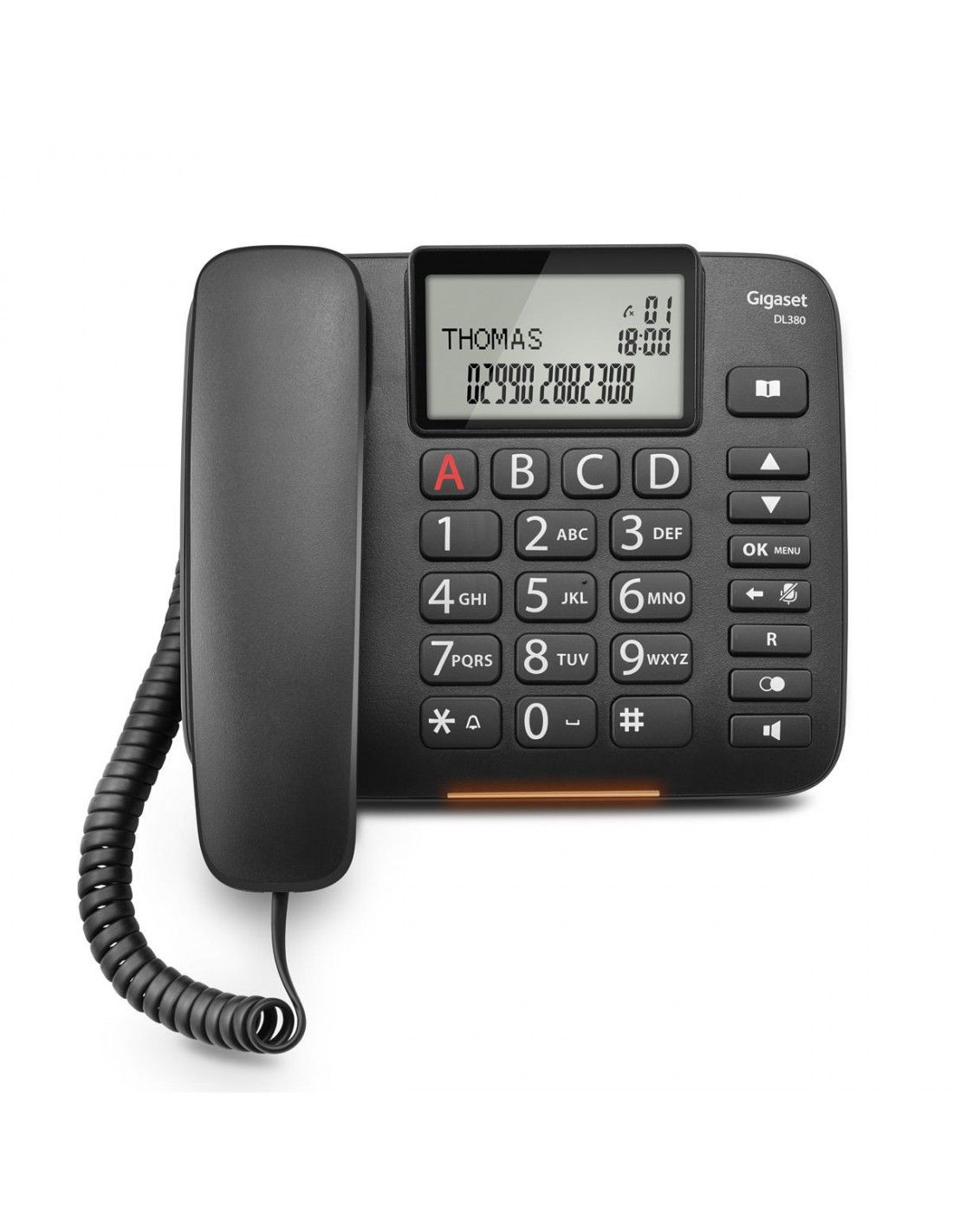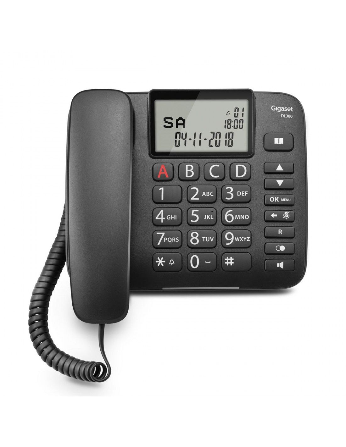 Gigaset DL380. Tipo: Telefono analogico, Tipo di apparecchio: Cornetta cablata. Telefono con vivavoce, Capacità rubrica: 99 voci. Identificatore di chiamata. Colore del prodotto: Nero. Numero di cornette incluse: 1
