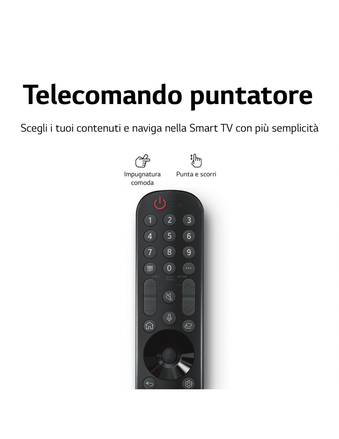 I TV LG QNED sono semplici da usare. Anzi, semplicissimi grazie all'esclusivo telecomando puntatore. Lo impugni come una bacchetta magica e lo usi come un mouse, muovendo il puntatore sullo schermo con un semplice gesto del polso. Così potrai accedere ai tuoi contenuti, navigare su Internet e aprire le app ancora più rapidamente. Il tutto supportato dalla piattaforma Smart TV webOS 22, ancora più intuitiva, completa e intelligente. Così "smart" che da quest'anno mette a tua disposizione una schermata principale diversa per ogni componente della tua famiglia, per consigliare a ciascuno contenuti specifici in base al proprio profilo.