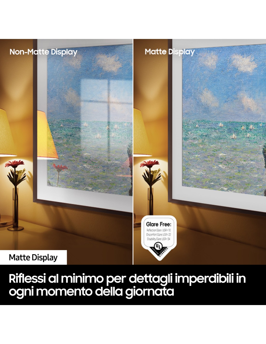 Non riesci a goderti lo spettacolo per colpa dei riflessi sullo schermo del TV? Il rivoluzionario Matte Display di The Frame assorbe la luce riflessa, rendendo più nitida ogni immagine e consentendoti di apprezzare fino in fondo tutti i dettagli e le sfumature delle tue opere d'arte preferite, esattamente come nei quadri originali.