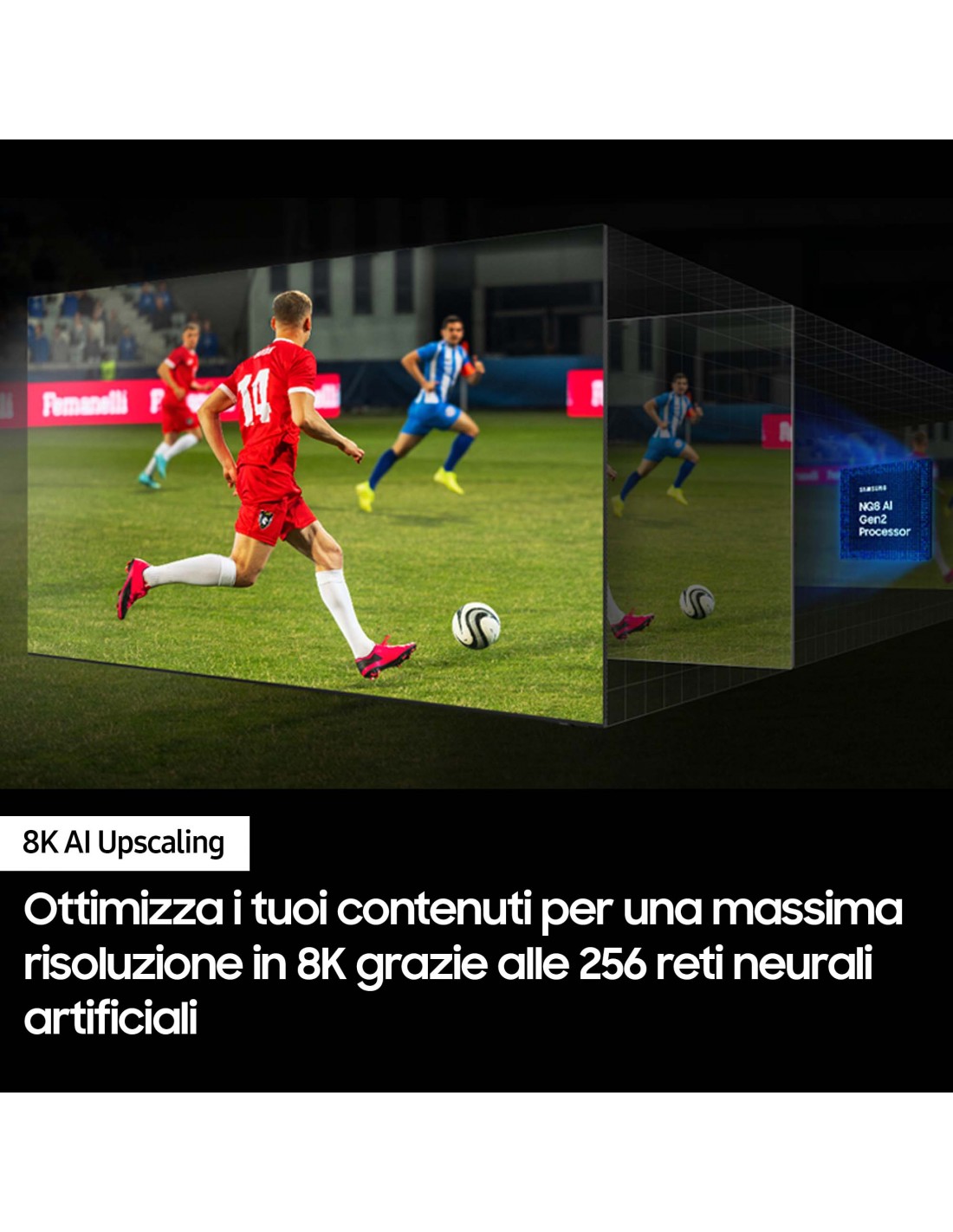 Grazie al supporto di 256 reti neurali basate sullintelligenza artificiale, la nostra tecnologia Upscaling AI 8K riproduce i contenuti con una risoluzione molto vicina al 8K. Il nostro processore NQ8 AI Gen2 consente di ottenere una qualità delle immagini estremamente nitida e fluida, tra le migliori disponibili in un TV Samsung.