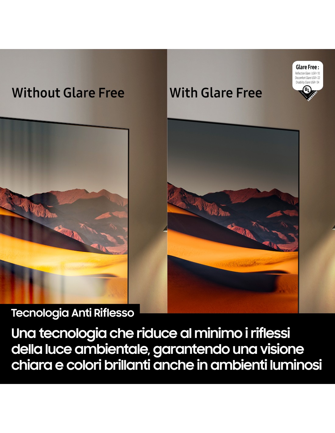 La nostra tecnologia Glare Free riduce al minimo i riflessi anche negli ambienti domestici con luci artificiali particolarmente intense. Da oggi potrai vedere perfettamente le immagini sullo schermo e guardare i tuoi contenuti senza riflessi fastidiosi.