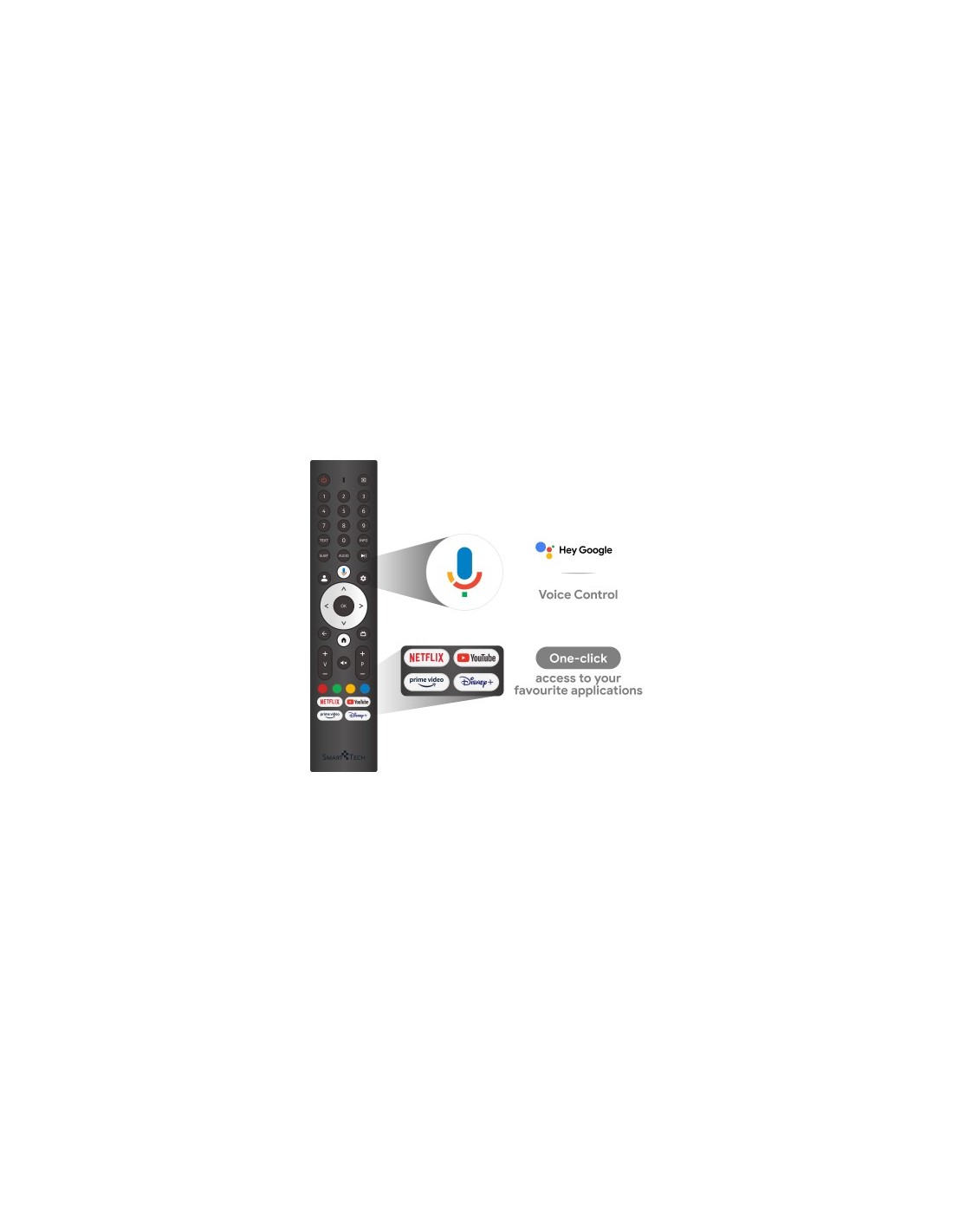 Smart-Tech 43QG02V. Dimensioni diagonale schermo: 109,2 cm (43"), Risoluzione del display: 3840 x 2160 Pixel, Tipologia HD: 4K Ultra HD, Tecnologia display: DLED, Forma dello schermo: Piatto. Smart TV. Luminosità schermo: 280 cd/m², Tempo di risposta: 6,5 ms, Rapporto di contrasto: 4000:1, Rapporto d'aspetto nativo: 16:9. Formato del segnale digitale: DVB-C, DVB-S, DVB-S2, DVB-T, DVB-T2. Wi-Fi, Collegamento ethernet LAN. Colore del prodotto: Grigio