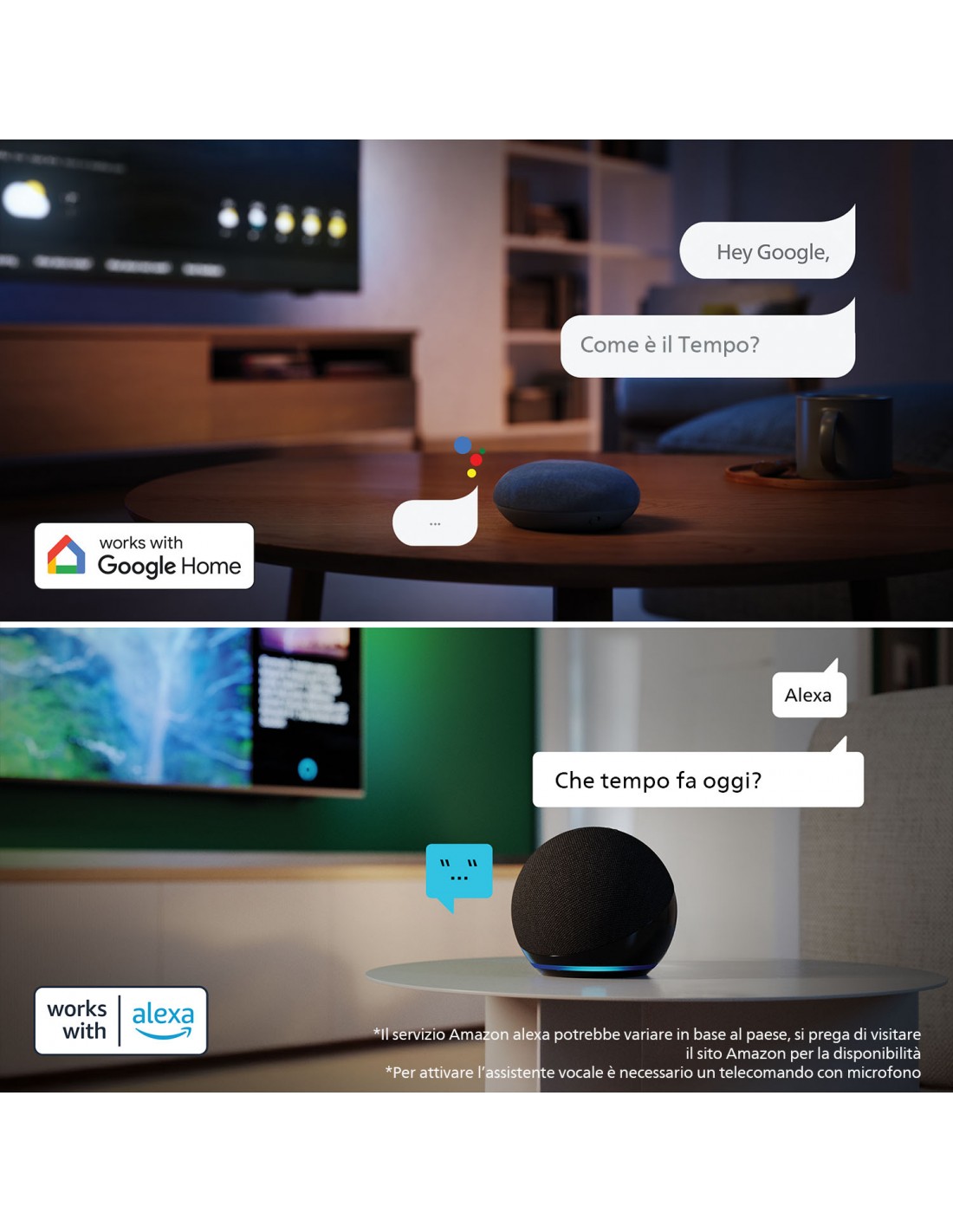 | Tecnologie Philips (AV/TV) | Amazon Alexa Built-in, Dolby Atmos®, Gamebar 2.0, IntelliSound Engine, Micro Dimming Premium, Perfect Natural Motion, Compatibile con Apple HomeKit, Works With Control4, Works With Matter |