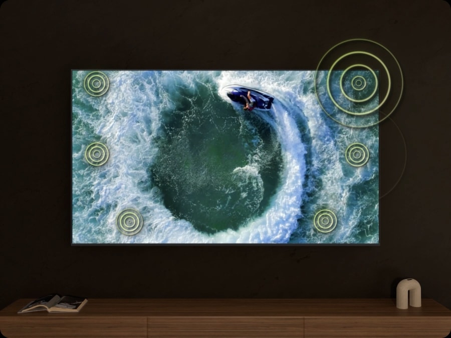 Entra nel vivo dell'azione. Grazie agli altoparlanti a 4.2.2 canali, questo TV riproduce i suoni alla massima potenza in ogni punto dello schermo. Grazie alla tecnologia di sincronizzazione dellaudio basata sullAI, i suoni seguono gli oggetti sullo schermo, per un audio surround di alta qualità con un effetto realistico.