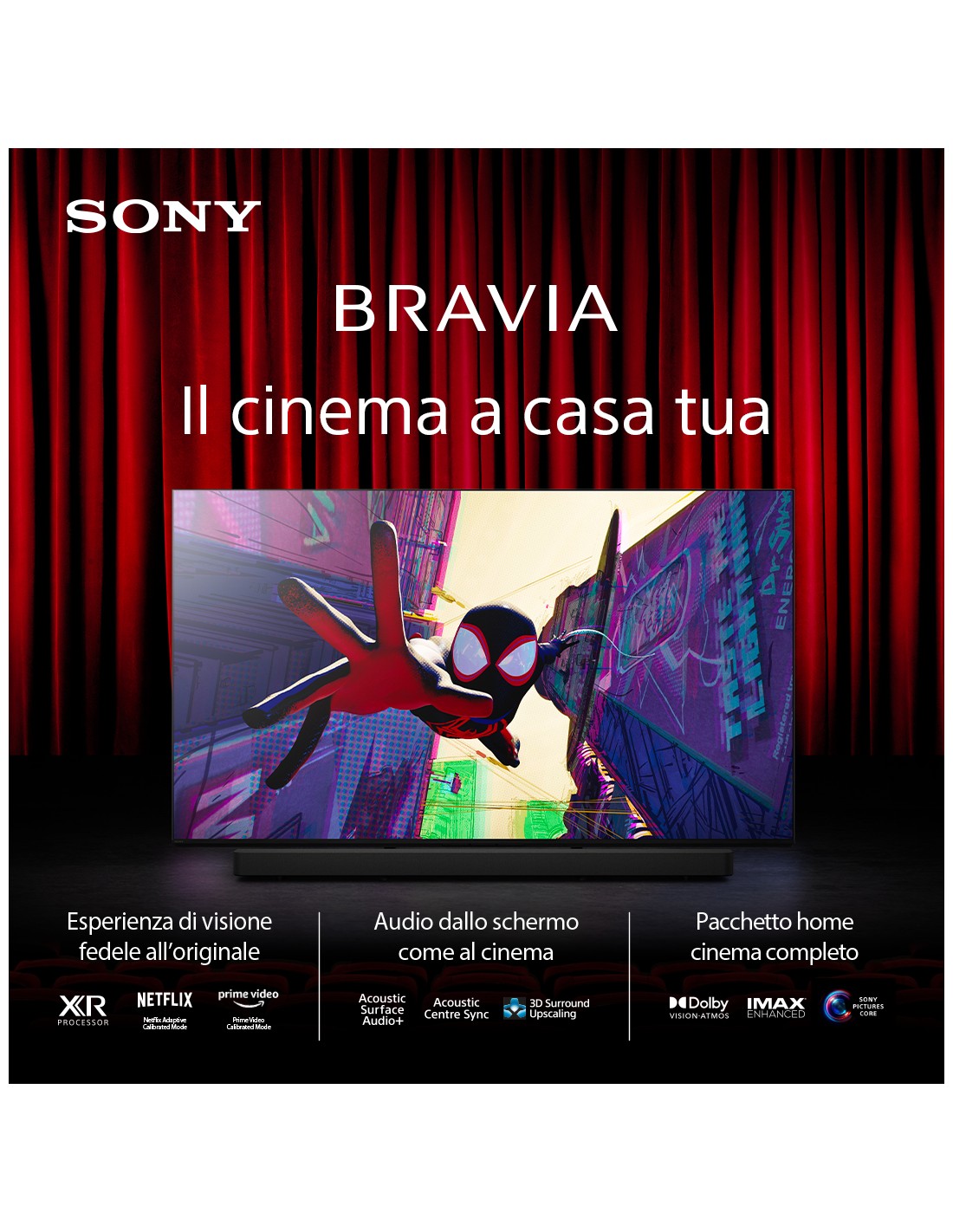 Utilizziamo la nostra esperienza nella produzione cinematografica per portare a casa tua la visione del creatore, collaborando con i migliori studi di streaming al mondo per sviluppare modalità calibrate specifiche(2) per i tuoi contenuti preferiti, tra cui Netflix e Prime Video(3). BRAVIA 8A soddisfa standard rigorosi per riprodurre titoli IMAX® Enhanced(4) e dispone anche di Dolby Vision®(5) e Dolby Atmos®: tecnologie direttamente dal cinema, ora sul tuo televisore."