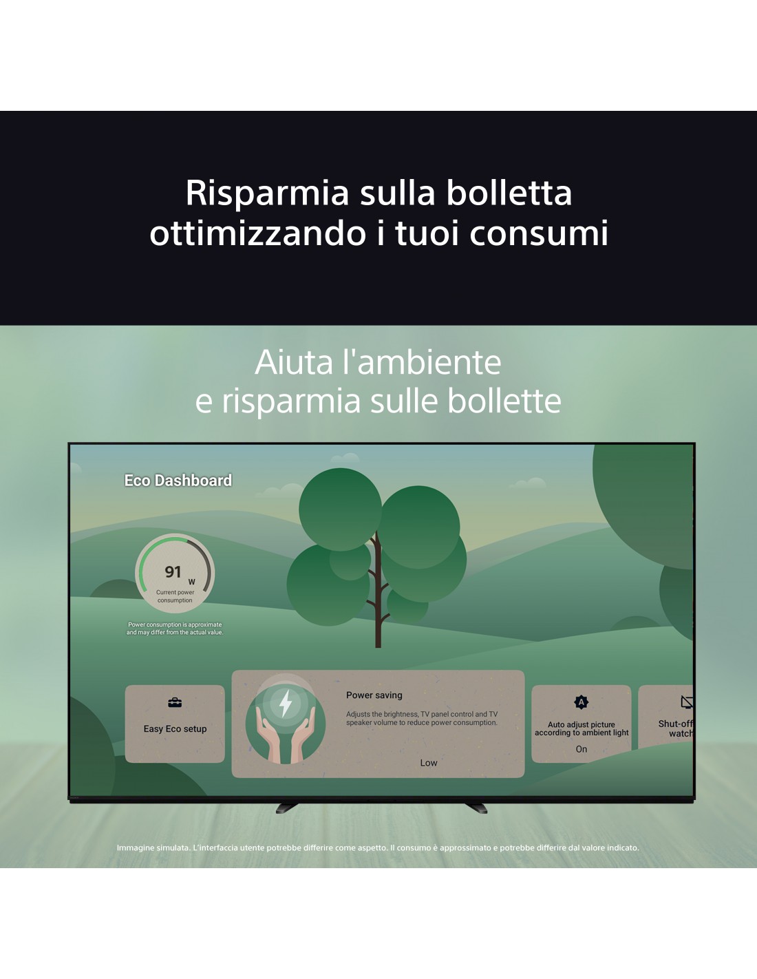 Puoi anche monitorare e regolare facilmente le impostazioni energetiche per un'efficienza ottimale utilizzando Eco Dashboard 2(6). Complessivamente,con questo televisorepotresti risparmiare fino a €XXX sulla bolletta energetica(7).