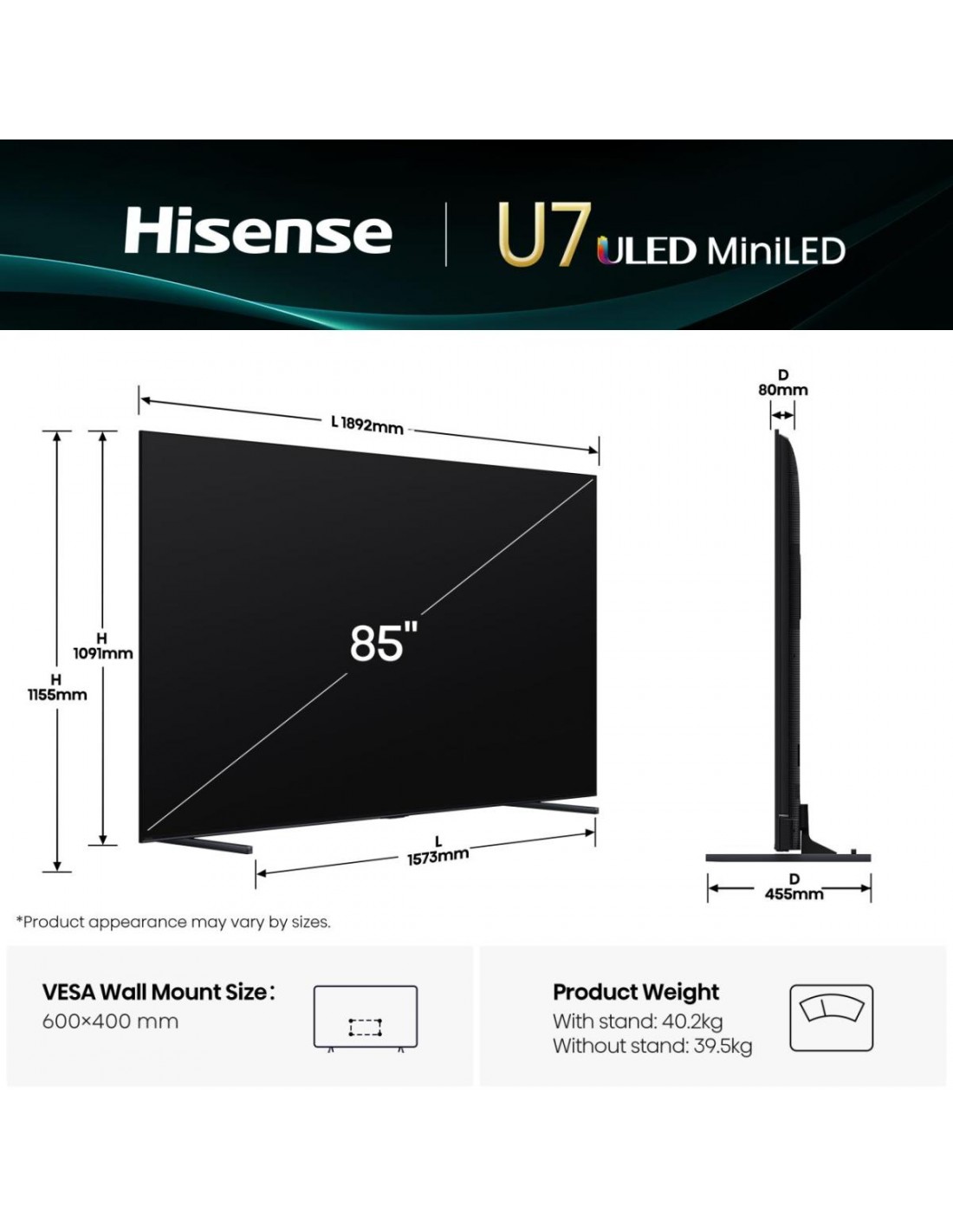 Hisense 85U7Q. Dimensioni diagonale schermo: 2,16 m (85"), Risoluzione del display: 3840 x 2160 Pixel, Tipologia HD: 4K Ultra HD, Tecnologia display: ULED, Forma dello schermo: Piatto, Tipo di retroilluminazione LED: Mini LED. Smart TV. Luminosità schermo: 450 cd/m², Tempo di risposta: 6 ms, Rapporto di contrasto: 5000:1, Rapporto d'aspetto nativo: 16:9. Formato del segnale digitale: DVB-C, DVB-S, DVB-S2, DVB-T, DVB-T2. Wi-Fi, Collegamento ethernet LAN. Colore del prodotto: Nero