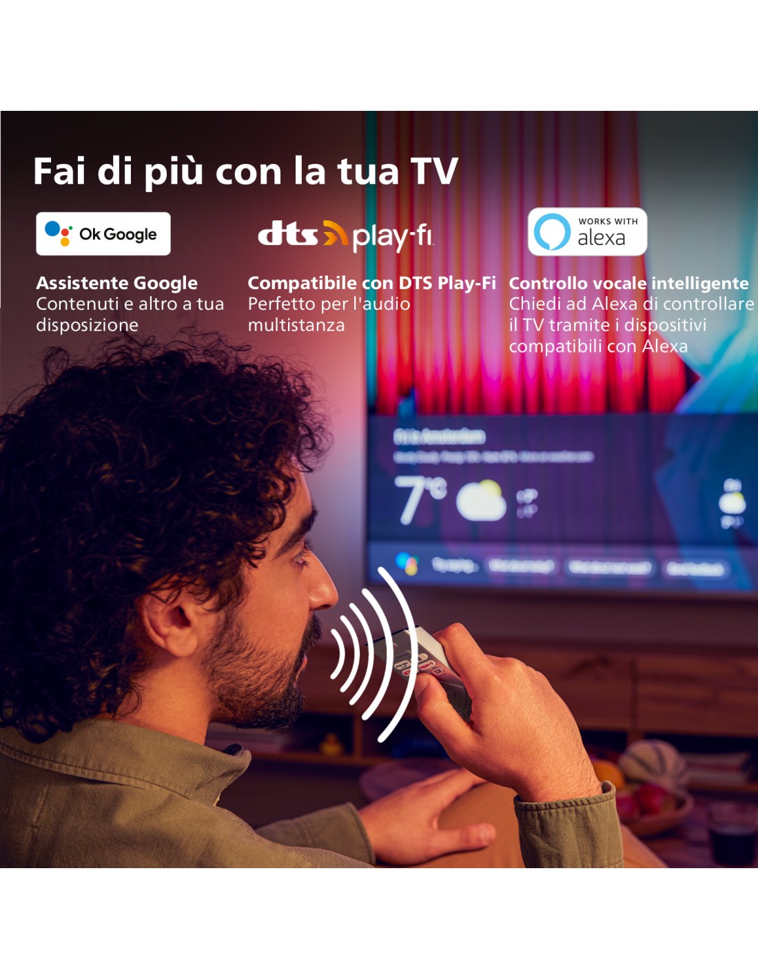Con Philips Ambilight, puoi vivere in prima persona ogni attimo. I LED intelligenti sui bordi del TV rispondono all'azione sullo schermo ed emettono una luce coinvolgente e affascinante. Provalo e non potrai più farne a meno.