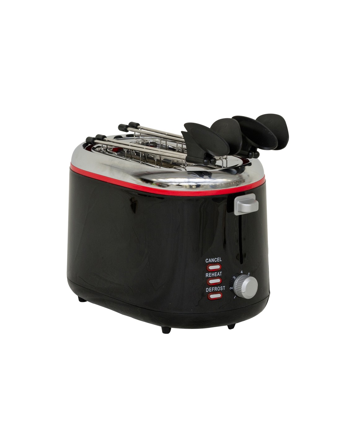 Tostapane nero con dettagli cromati e pinze in acciaio inox. Timer. Pareti fredde. Vassoio raccoglibriciole removibile, facile da pulire. Avvolgicavo.