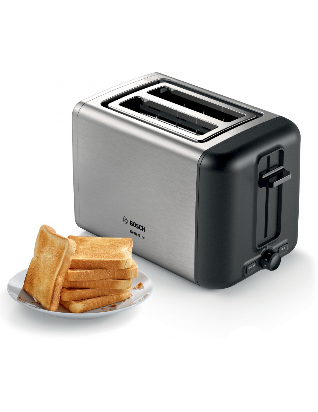 Bosch TAT3P420 Tostapane compatto DesignLine Inox. Numero di fette: 2 fetta/e, Colore del prodotto: Acciaio inox, Materiale della scocca: Acciaio inox. Potenza: 970 W, Tensione di ingresso AC: 220 - 240 V, Frequenza di ingresso AC: 50 - 60 Hz. Lunghezza cavo: 0,9 m, Larghezza: 300 mm, Profondità: 170 mm. Larghezza imballo: 206 mm, Profondità imballo: 342 mm, Altezza imballo: 220 mm