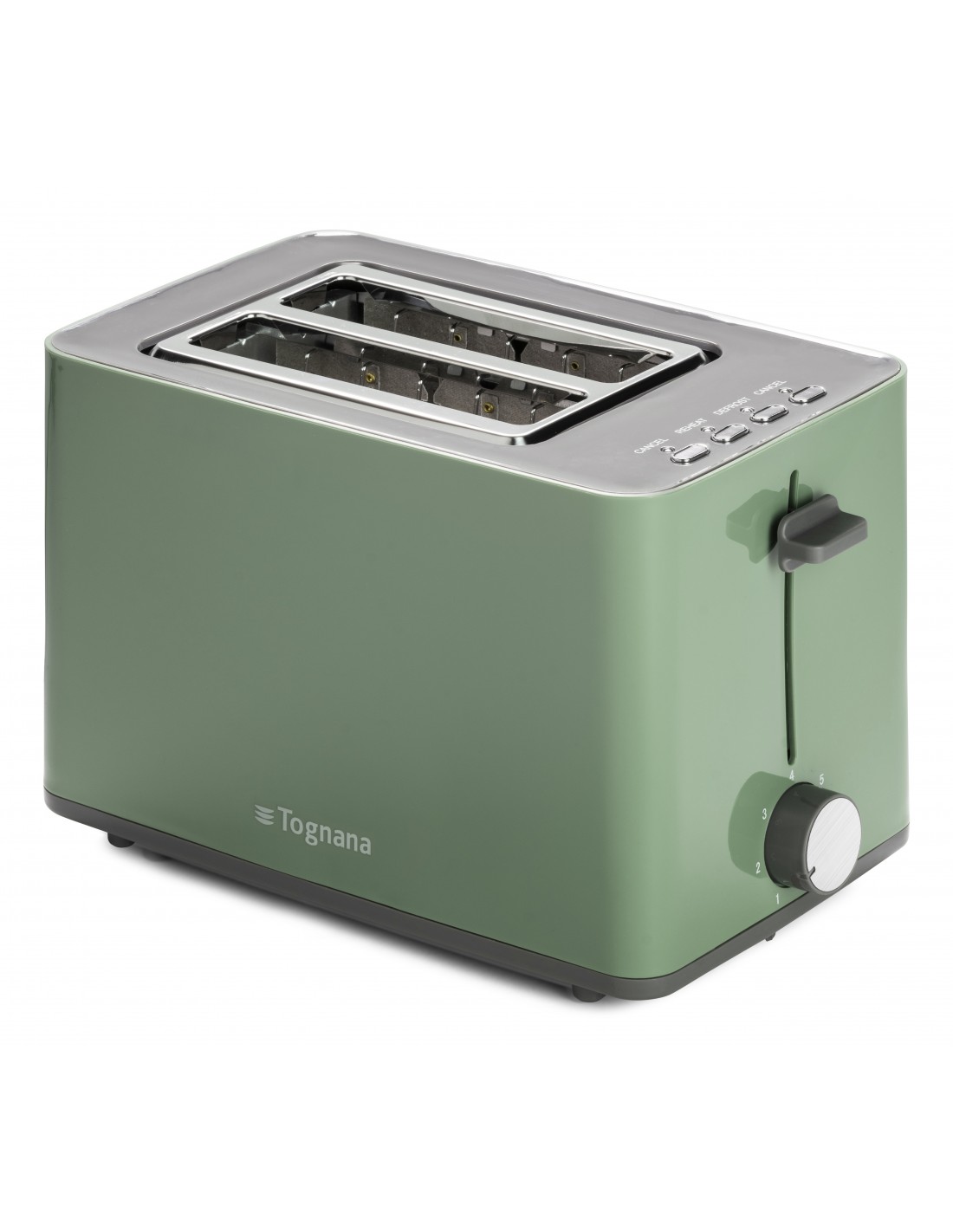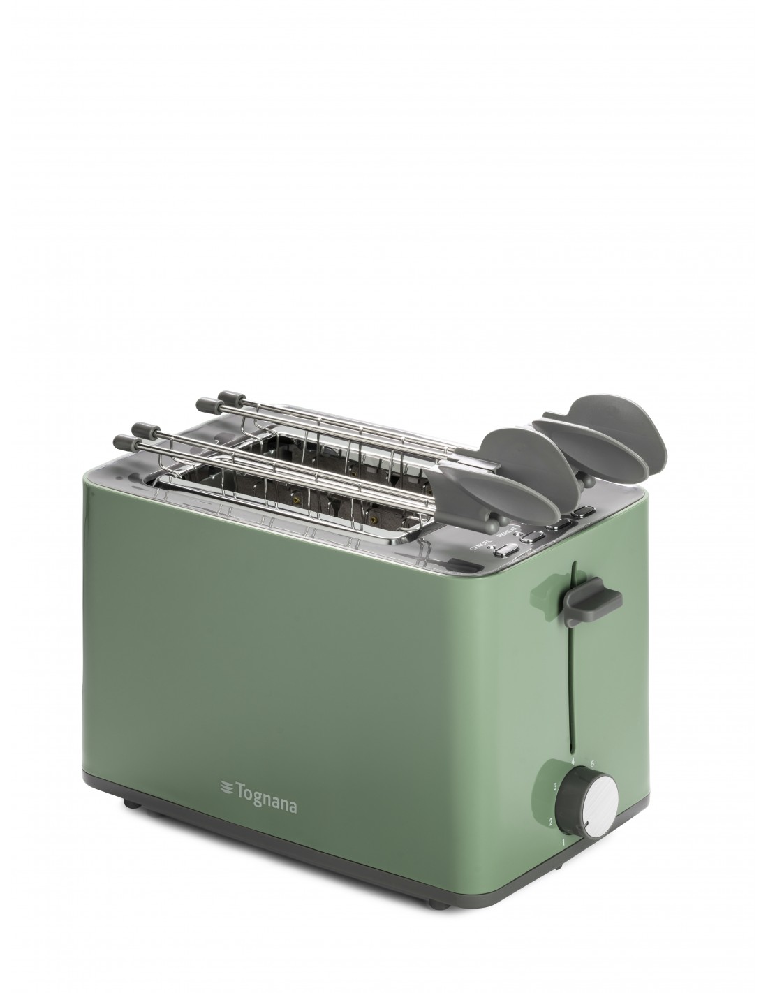 TOSTAPANE CON PINZE: design compatto, indicatore LED, doppia pinza in acciaio inox, 4 funzioni, 6 livelli doratura, spegnimento automatico, piedini antiscivolo, vassoio raccoglibriciole estraibile, 850W, colore verde salvia