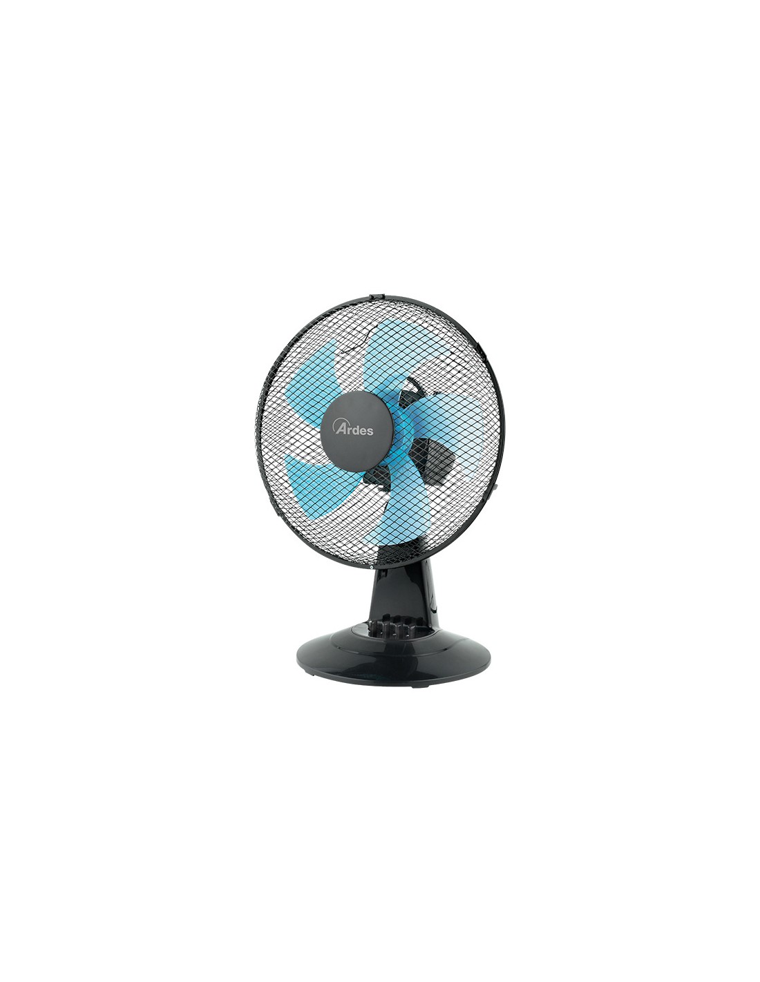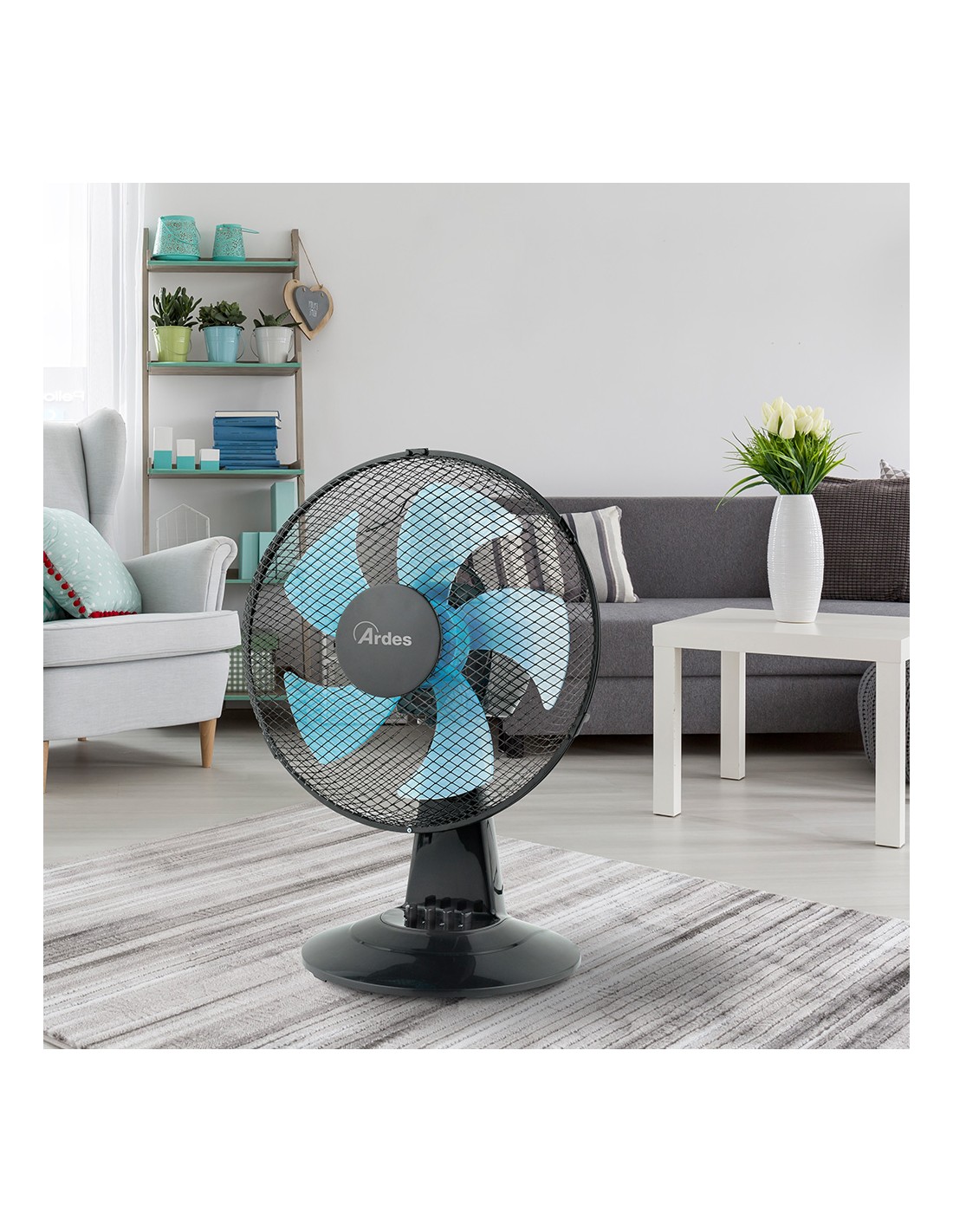 Ventilatore da tavolo Ø 30 cm, pala colorata in semitrasparenza turchese. 5 pale, griglia a nido d’ape, oscillazione laterale automatica.