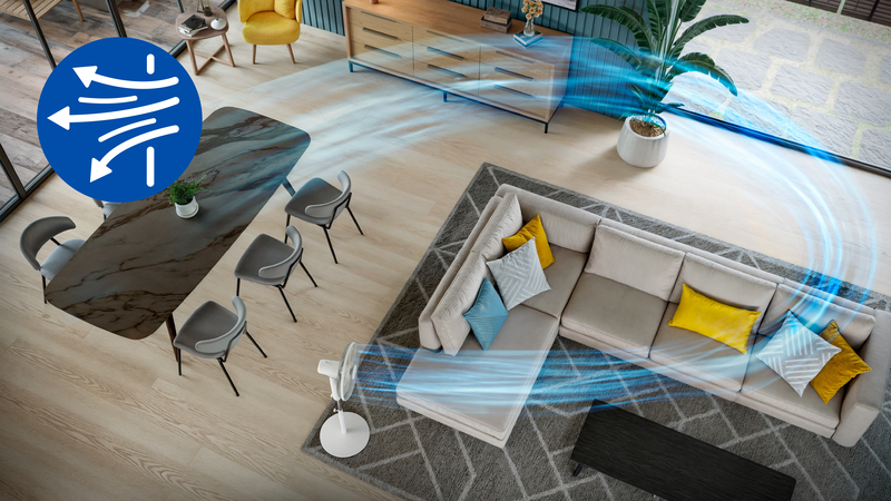 Garantisce una circolazione ottimale dell'aria grazie alla rotazione di 80° e all'inclinazione di 30° della testa inclinabile, consentendo alla brezza di distribuirsi uniformemente in tutto l'ambiente.