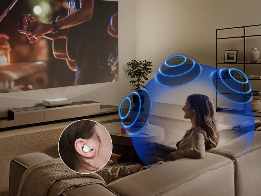 Utilizzando i Galaxy Buds con la modalità Audio 360, potrai ottenere da The Premiere un suono più realistico rispetto a quello delle cuffie. Grazie al multicanale diretto e a una funzione head tracking sempre più efficiente, la direzione del suono cambia in base ai movimenti del capo degli spettatori, per un'esperienza spaziale in 3D e un suono più immersivo che mai.