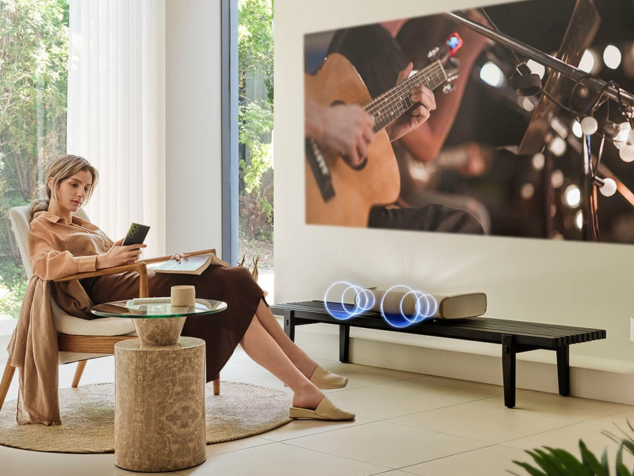 Q-SymphonyPer un suono ancora più straordinario, collega la tua soundbar o Music Frame a The Premiere. Grazie alla tecnologia Q-Symphony, i tuoi dispositivi possono riprodurre laudio allunisono senza disattivare gli altoparlanti.