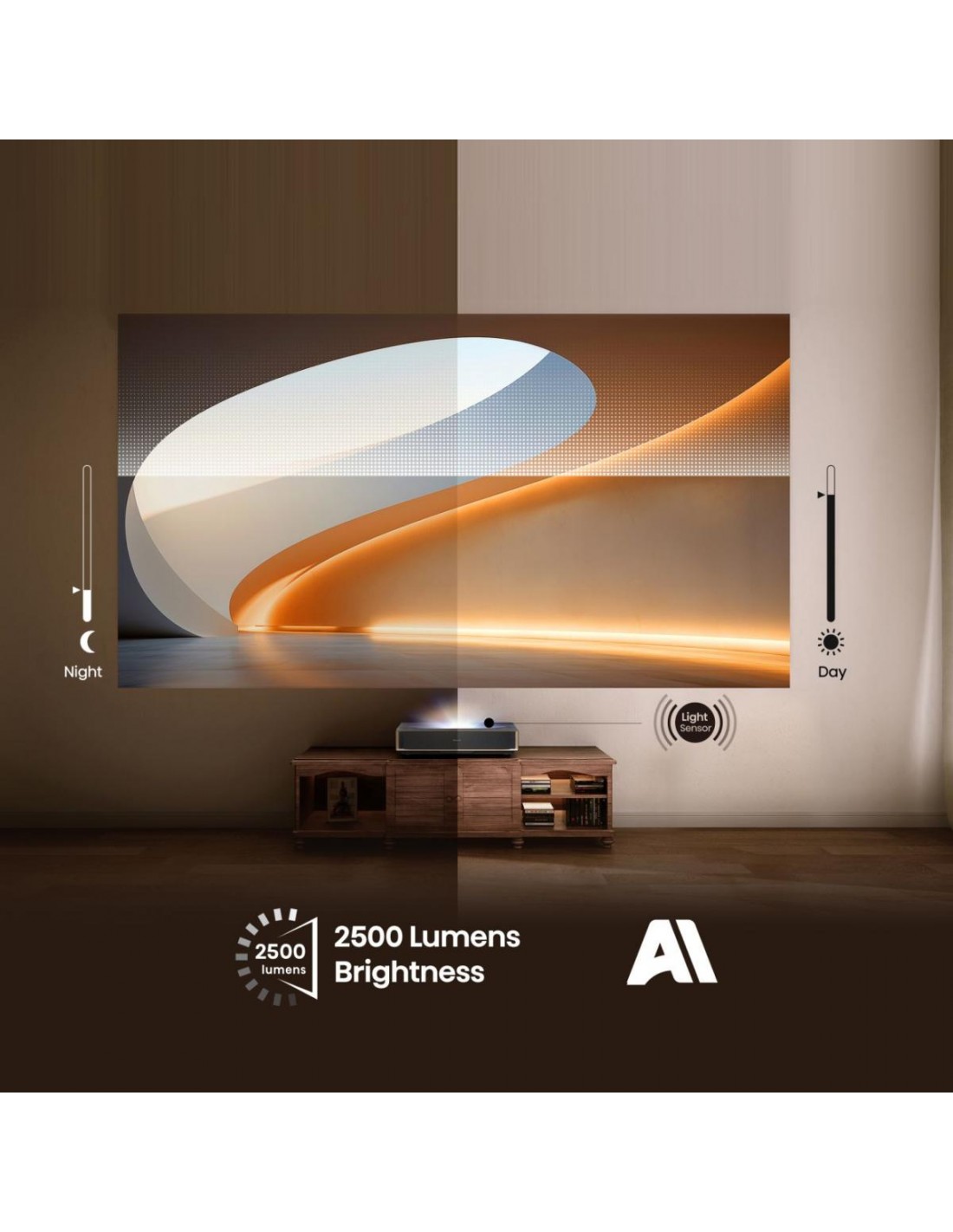 Immergiti in un mondo dove le luci abbagliano e le ombre si fanno più profonde. Con una straordinaria luminosità di 2500 ANSI Lumen, ogni dettaglio sottile emerge con chiarezza. L’avanzata Ottimizzazione della Luce tramite AI regola dinamicamente la luminosità in base all’ambiente e ai contenuti, garantendo un’esperienza visiva perfettamente vivace ma sempre confortevole.